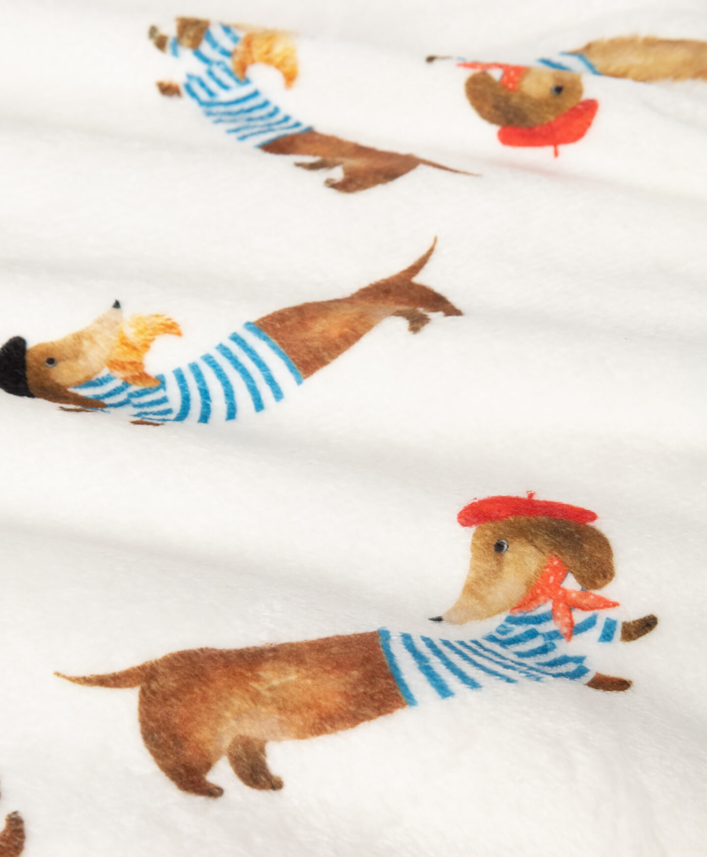 Deka dimenzija 150 x 200 cm s motivom jazavčara lagana je, topla i mekana. Uvijek ćete se htjeti umotati u nju tijekom dugih večeri uz omiljenu knjigu ili film. Motiv elegantnih pasa u beretkama dodat će dašak boje vremenu provedenom s vašim voljenima!