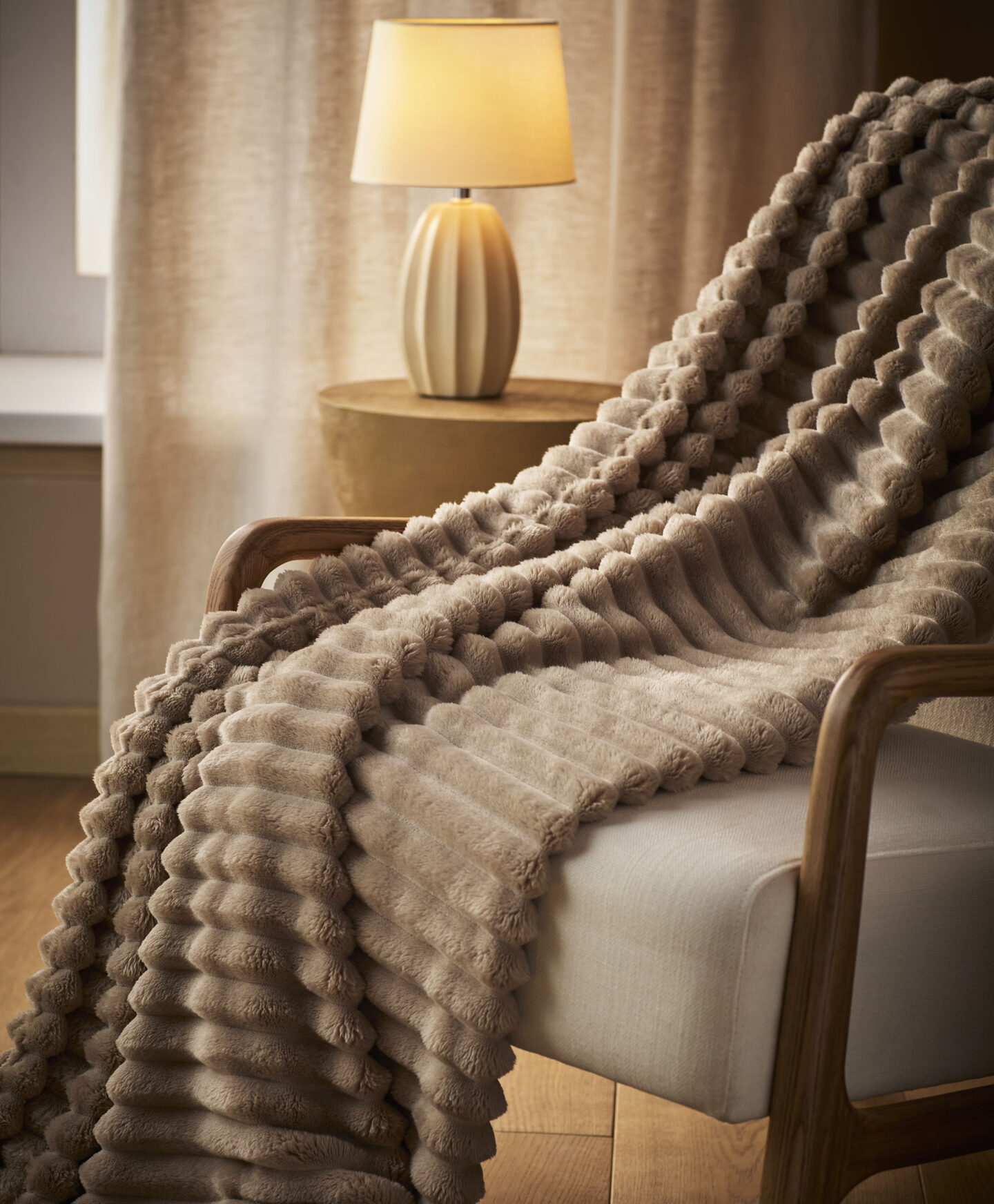 Smeđa deka sa širokim prugama obgrlit će vas udobnošću tijekom hladnih večeri. Ugodna je na dodir i ima dekorativnu teksturu koja će učiniti svaki interijer toplijim. Ukrasna deka također je sjajna ideja za poklon svakome tko voli mirne večeri provedene kod kuće. U ponudi su dostupne tri boje.