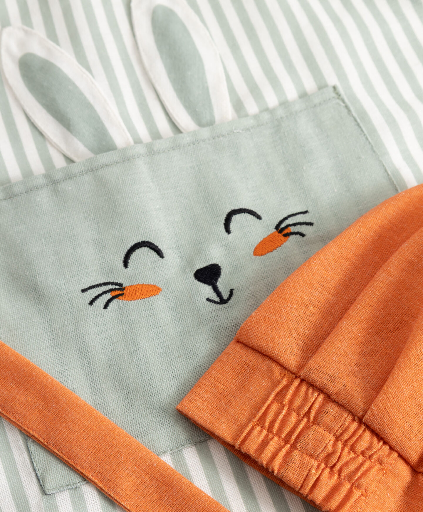 Dječja pregača s otiskom zeca sigurno će izmamiti osmijehe na svako lice tijekom pripreme omiljenih jela zajedno s vašim djetetom. Proljetni motiv potiče djecu da se uključe u kuhinjske aktivnosti, a čičak kopčanje i vezica u struku osiguravaju savršeno pristajanje. Pregača je udobna, lagana i otporna na pranje. Kapa koja dolazi u kompletu upotpunjuje odjevnu kombinaciju malog kuhara.