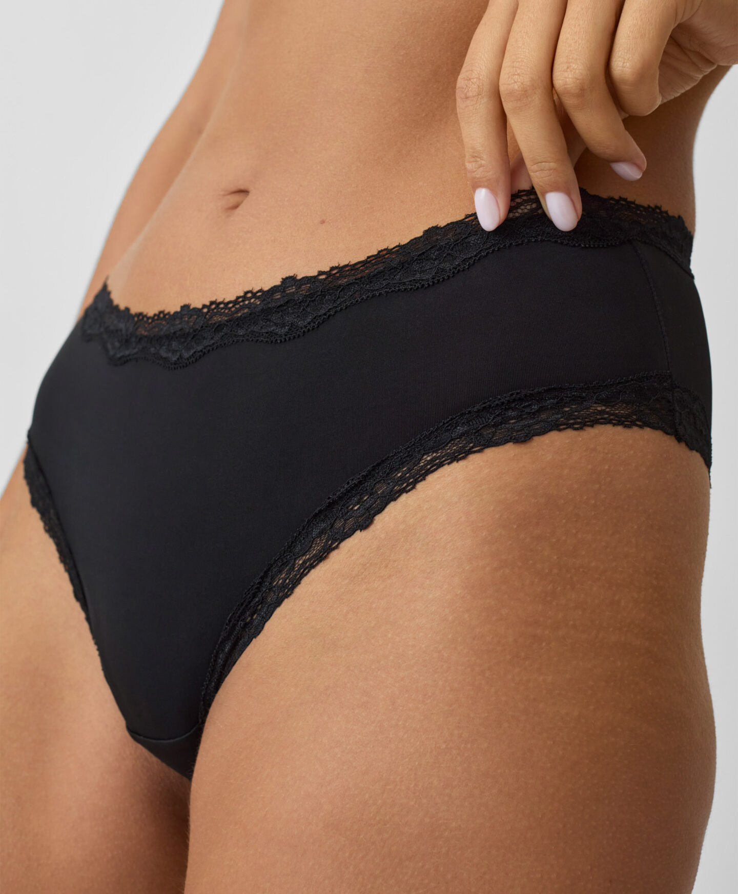 Gaćice s pamučnim umetkom udoban su odabir za svaki dan. Elegantna crna boja i detalji od čipke čine ih senzualnima. Gaćice savršeno pristaju uz tijelo, naglašavajući njegove adute. Ne ocrtavaju se ispod odjeće, pružajući vam samopouzdanje i osiguravajući diskreciju.