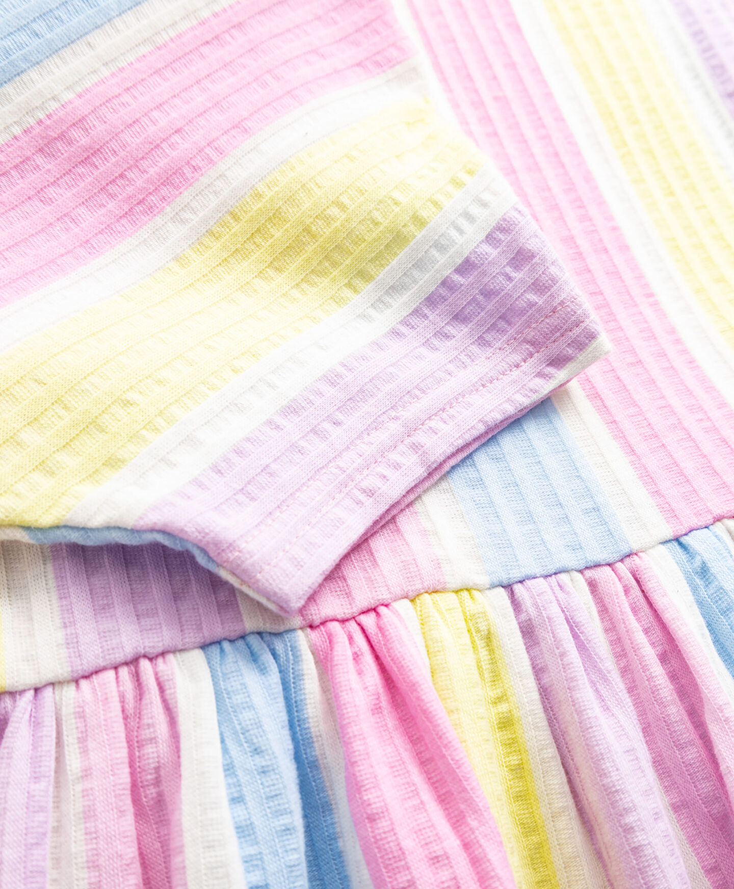 Haljina od 100% pamuka za djevojčice spaja bezvremenski stil i udobnost. Pastelne pruge najtraženiji su trend sezone. Haljina je dizajnirana kako bi omogućila nesputano kretanje. Lepršava suknja dodaje dašak neodoljivost i bezbrižnosti svakoj odjevnoj kombinaciji.