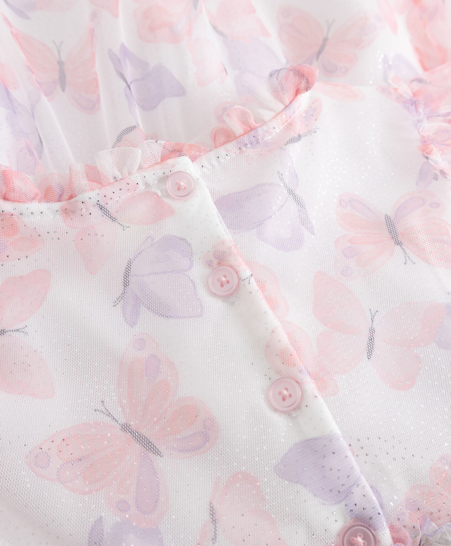 Haljina s motivom leptira očarat će svaku malu damu. Izrađena je od prozračnog tila pa je lagana i jamči udobnost čak i tijekom toplih dana. Lepršavi rukavi, ovratnik s volanima i ukrasni nabori čine haljinu romantičnom i elegantnom. Prozračna tkanina pruža dodatan osjećaj lakoće, dok šarmantan motiv leptira dodaje dašak zaigranosti. Suptilne blistave točkice prekrasno se sjaje i čine haljinu posebnom.