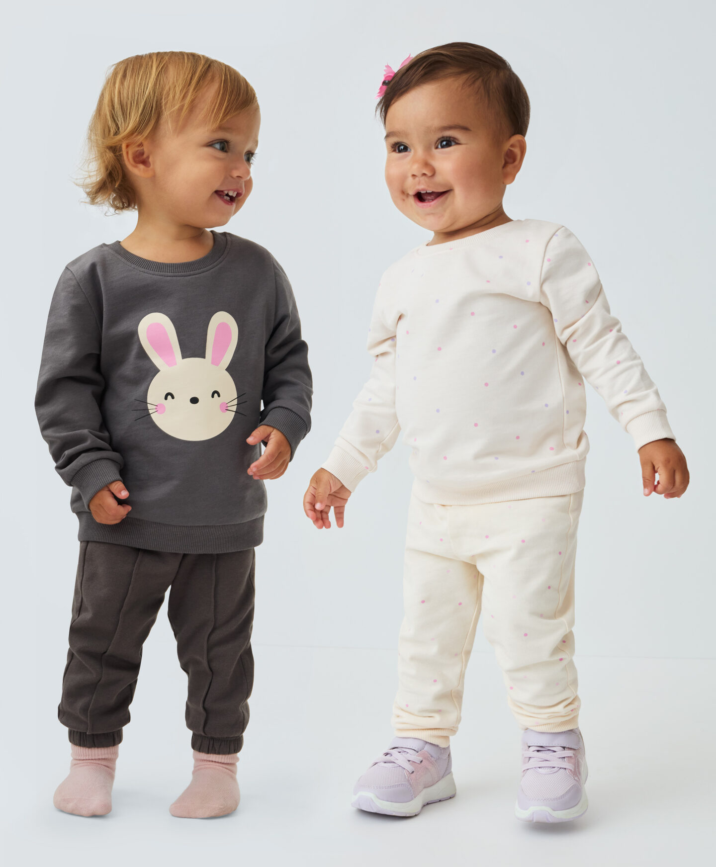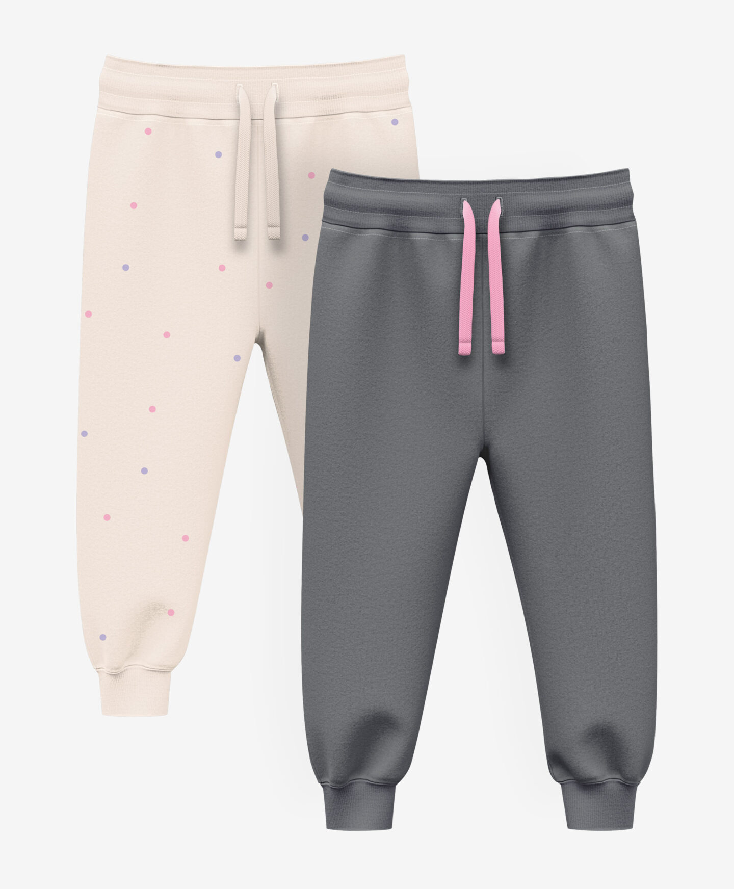 Komplet 2 donja dijela trenirke od 100% pamuka s točkicama za bebe djevojčice neizostavan je dio svakog dječjeg ormara. Donji dijelovi trenirki su mekani i nježni prema koži, a svaki par ukrašen je različitim motivom. Imaju elastične manžete i vezicu u struku, što osigurava savršeno pristajanje za svaku djevojčicu.