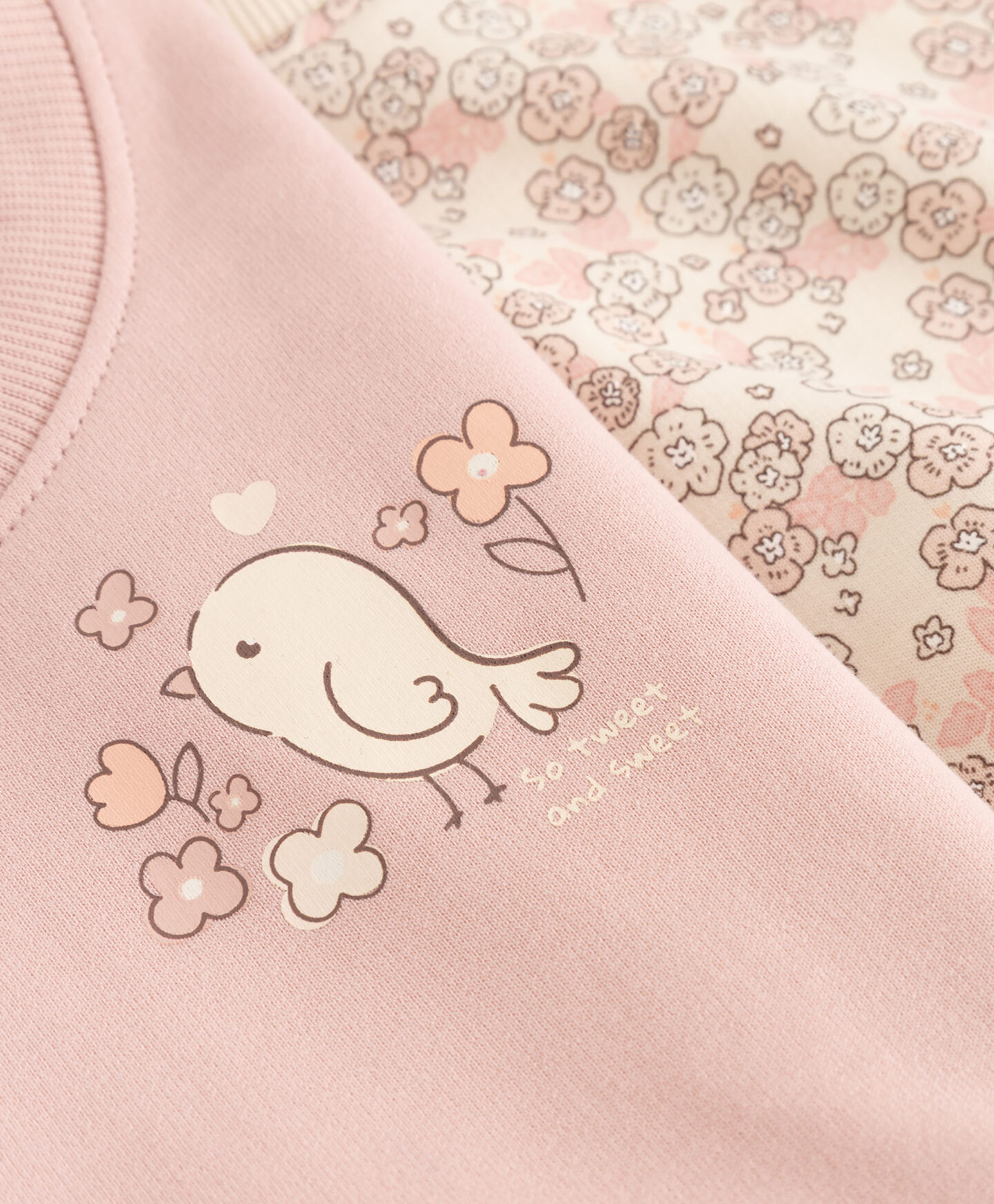 Komplet 2 gornja dijela trenirke od 100% pamuka za bebe djevojčice istaknut će se u garderobi vaše bebe. Svaki odjevni komad krasi drugi proljetni motiv. Majice su mekane i tople te izvrsne za slojevite odjevne kombinacije. Prirodan materijal nježan je prema koži i prozračan pa osigurava udobnost iz dana u dan. U ponudi potražite i donje dijelove trenirke koji savršeno pristaju uz ovaj komplet.