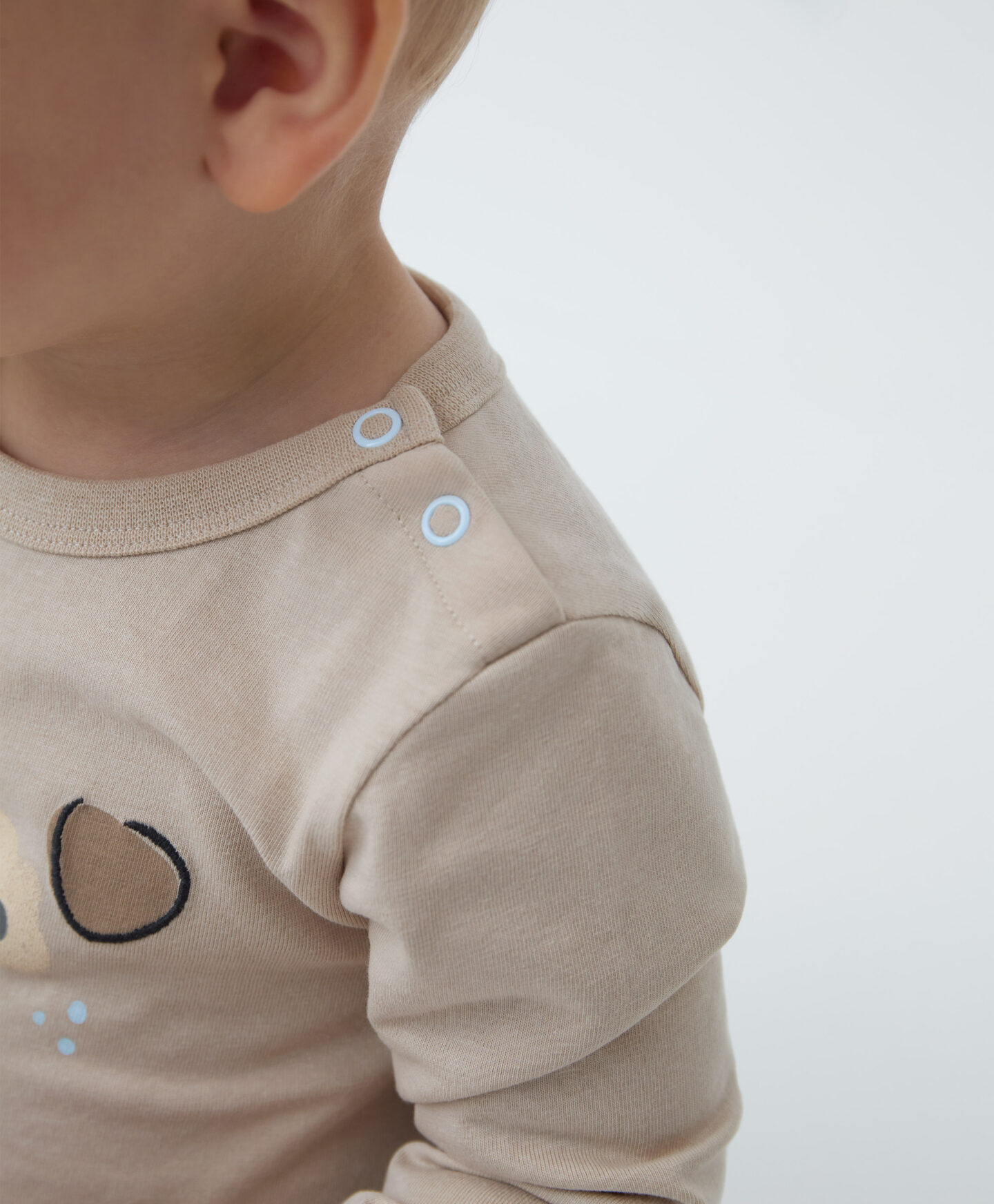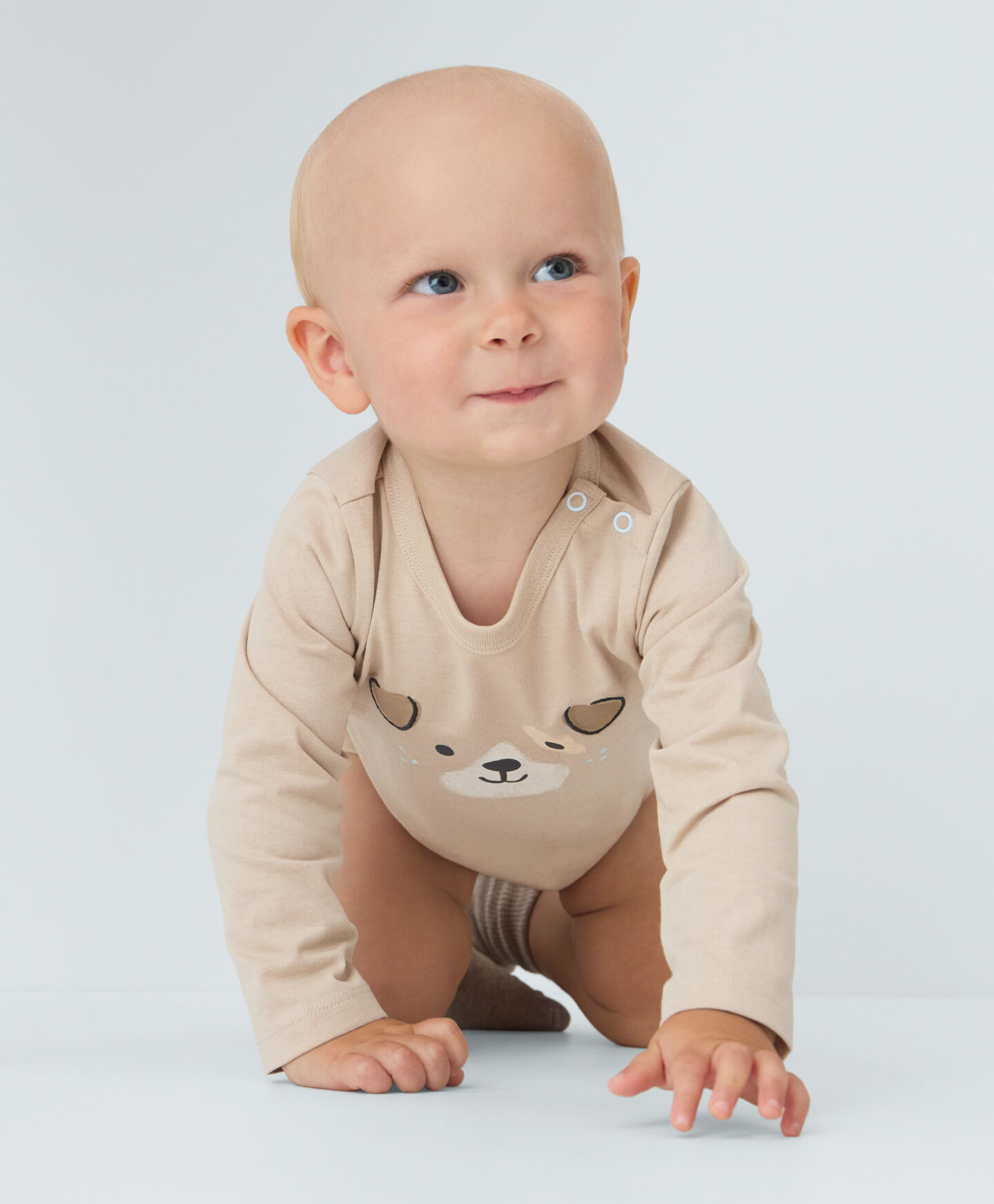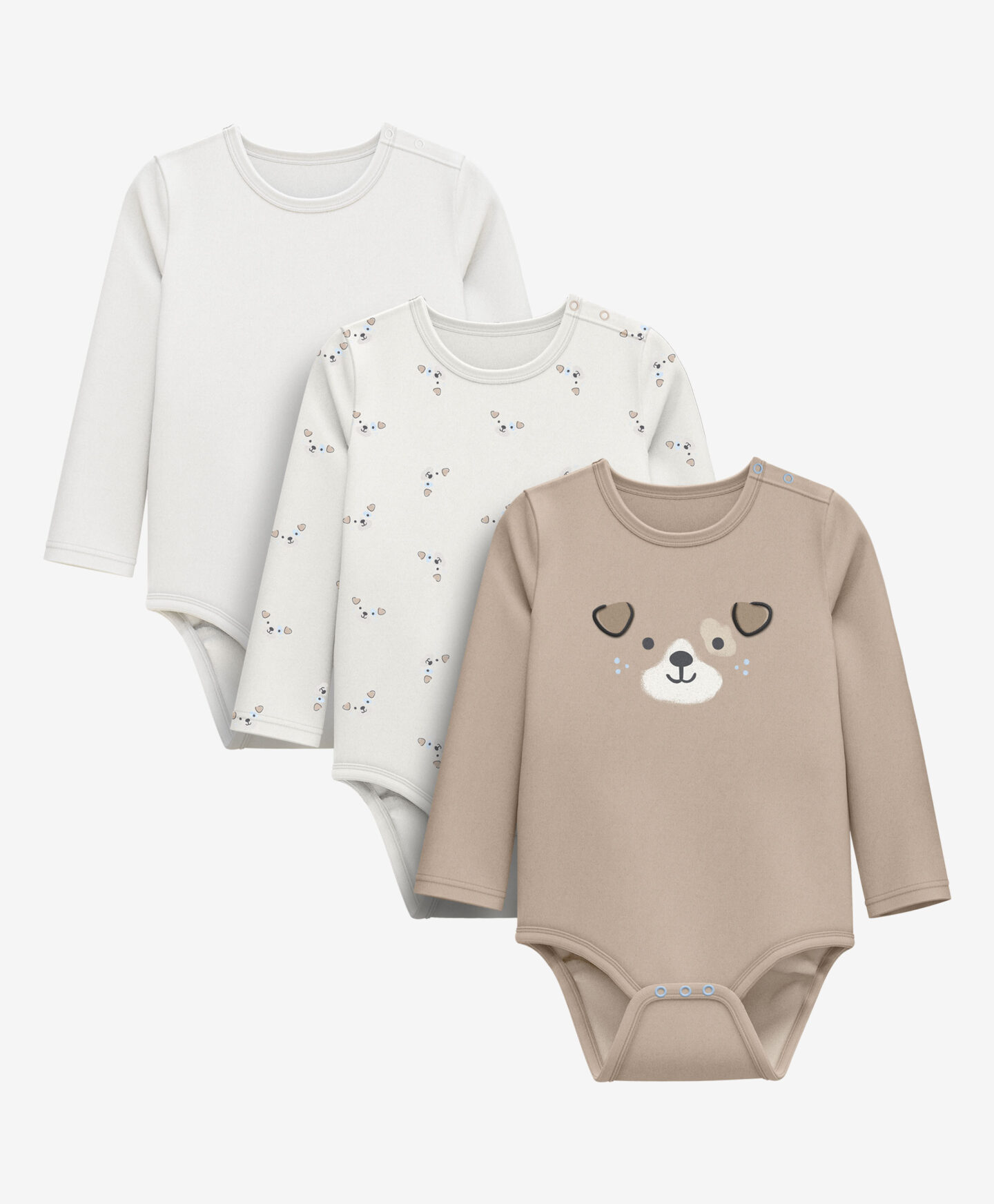 Komplet 3 bodija od 100% pamuka s motivom pasa za bebe dječake stvoren je za male ljubitelje životinja. Bodiji su izrađeni od prirodnih vlakana, prozračni i udobni za nošenje. Praktično kopčanje olakšava brzo presvlačenje pelena i oblačenje. Na izbor između nekoliko motiva.