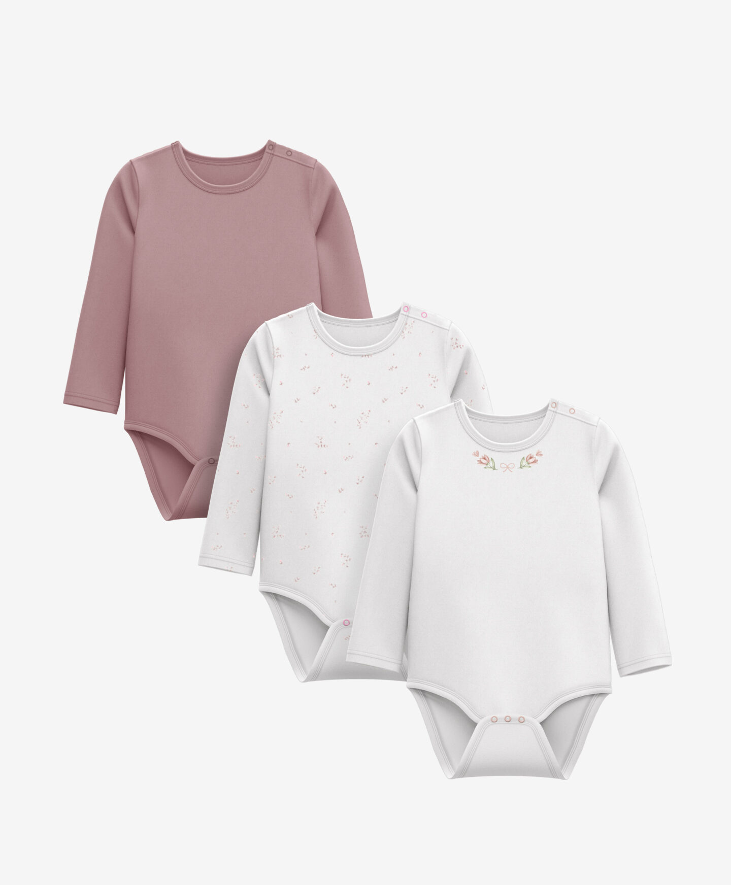 Komplet 3 bodija od 100% pamuka s cvjetnim motivima za bebe djevojčice dizajniran je za male ljubiteljice prirode. Slatki motiv s cvijećem razveselit će svaku djevojčicu. Bodiji su izrađeni od pamuka koji ih čini prozračnima i mekanima na dodir. Praktično kopčanje olakšava brze promjene pelena i oblačenje. Na izbor između nekoliko motiva.