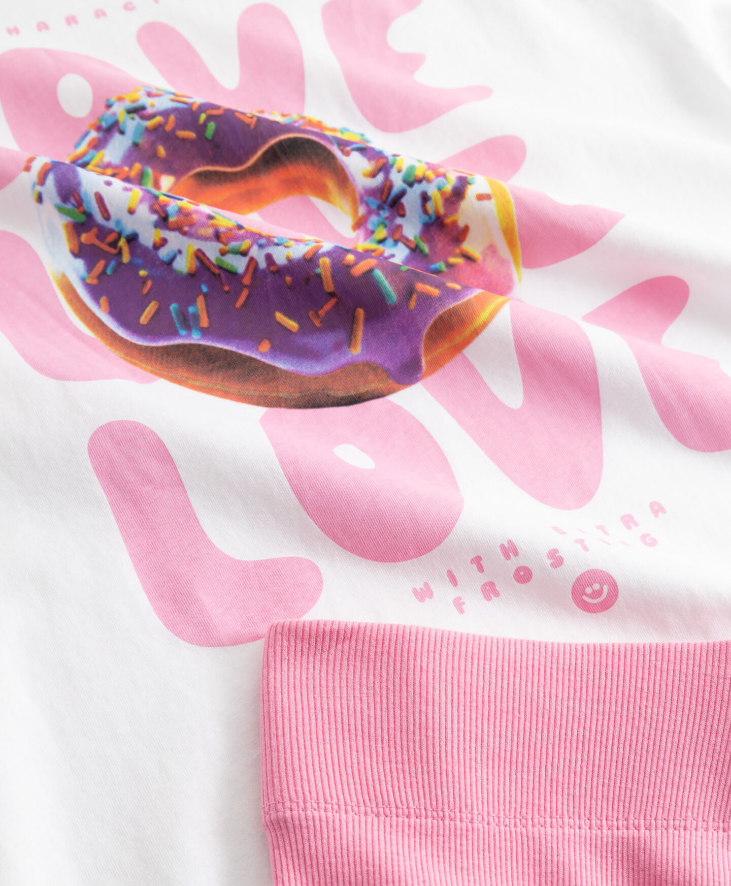 Komplet s motivom krafne za djevojčice sastoji se od majice kratkih rukava i biciklističkih kratkih hlača. Majica je izrađena od mekanog pamučnog materijala koji je nježan prema koži, a grafika jednoroga na prsima osvojit će svaku ljubiteljicu ovih bajkovitih stvorenja. Kratke hlače s visokim udjelom pamuka elastične su i lijepo pristaju figuri, pružajući potpunu slobodu kretanja tijekom igre. Dostupni su različiti motivi.