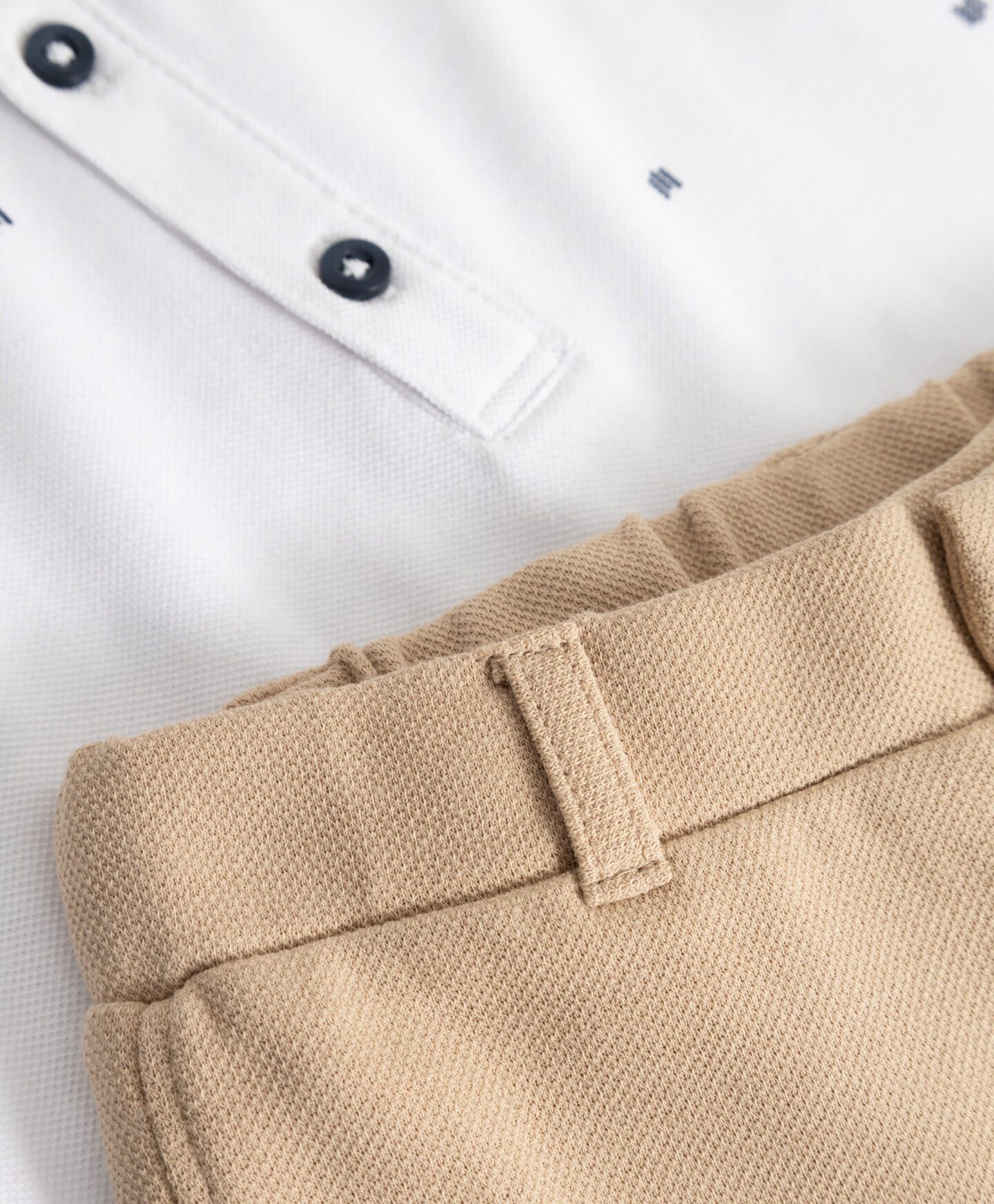 Komplet za bebe dječake sadrži udobne hlače i polo majicu. Već je spremna odjevna kombinacija za vašeg mališana, koju možete upotpuniti vestom iz kolekcije tijekom hladnijih dana. Mekani materijali, ugodni za kožu, čine ga savršenim izborom već od najranijih trenutaka. Komplet je idealan i za svaki dan i za svečane prigode. Također je izvrstan poklon za male šarmere.