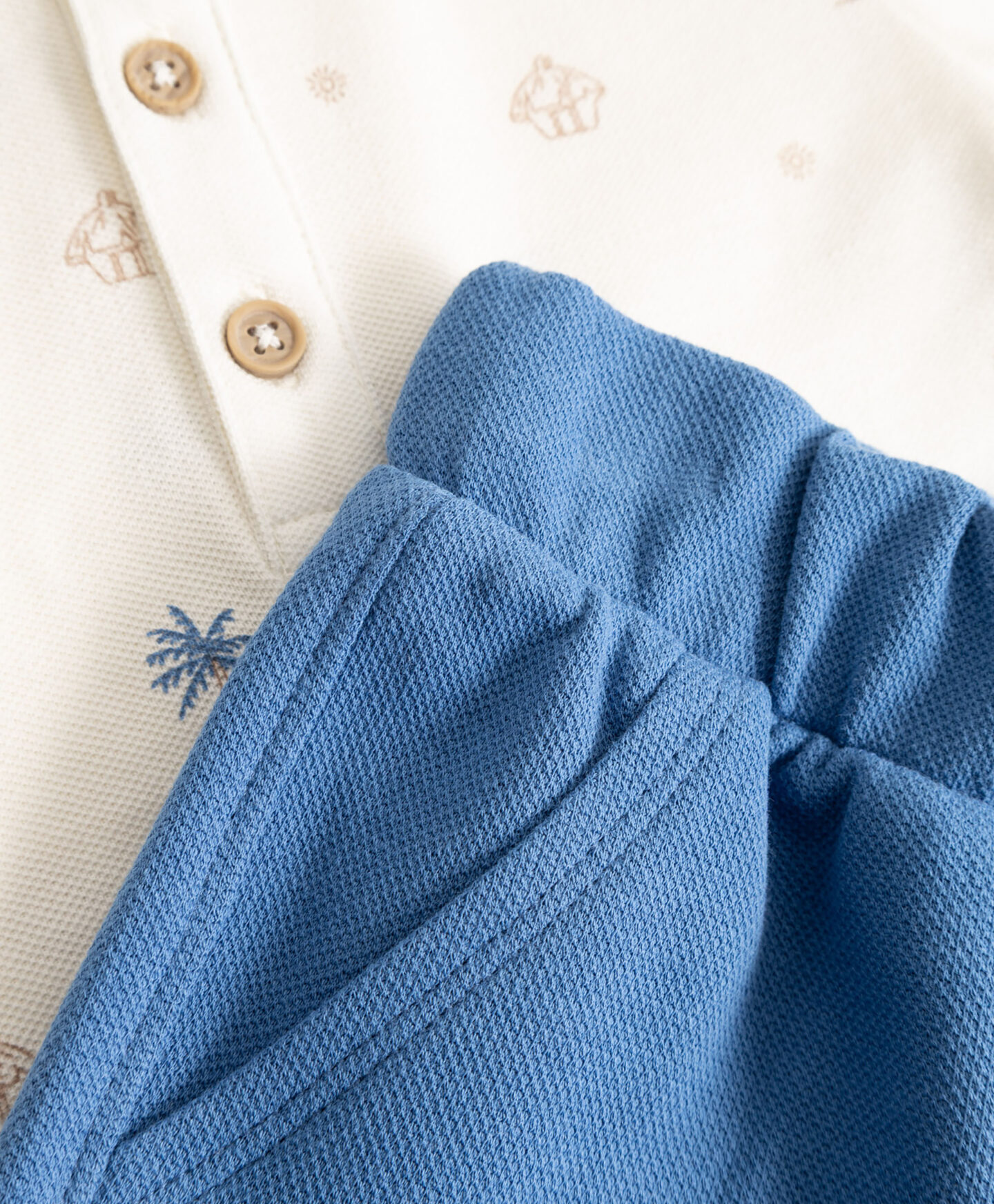 Komplet za bebe dječake spaja eleganciju i udobnost. Sastoji se od udobnih kratkih hlača i polo majice. Mekana elastična traka u struku osigurava da hlače ostaju na mjestu čak i pri intenzivnom kretanju, a ne pritišću mali trbuščić vašeg djeteta. Dizajn kratkih hlača ostavlja dovoljno prostora za pelene. Komplet također sadrži polo majicu s praktičnim gumbima ispod vrata koji olakšavaju oblačenje bebe, a mekani ovratnik neće iritirati bebin vrat. Posebnu pažnju zaslužuje i slatki motiv koji čini cijelu odjevnu kombinaciju neodoljivom.