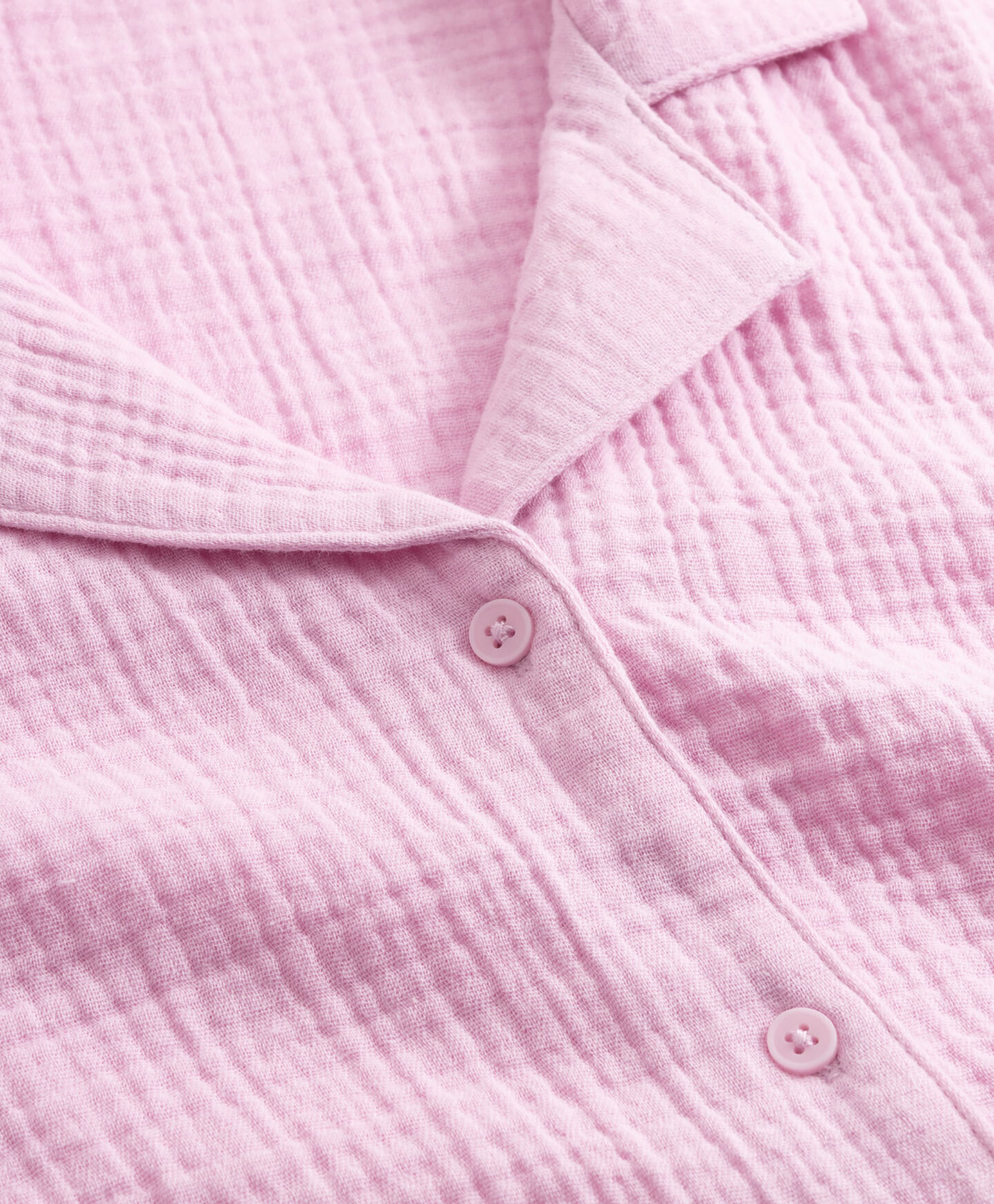 Košulja od 100% pamuka za djevojčice spaja romantičan stil i udobnost. Muslin tkanina iznimno je nježna, idealna za osjetljivu kožu sklonu iritacijama. Ljeti hladi, a tijekom hladnih večeri grije vašu djevojčicu i osigurava optimalnu tjelesnu temperaturu. Suptilna ružičasta boja dašak je svježine i pristaje uz svaku ljetnu kombinaciju.