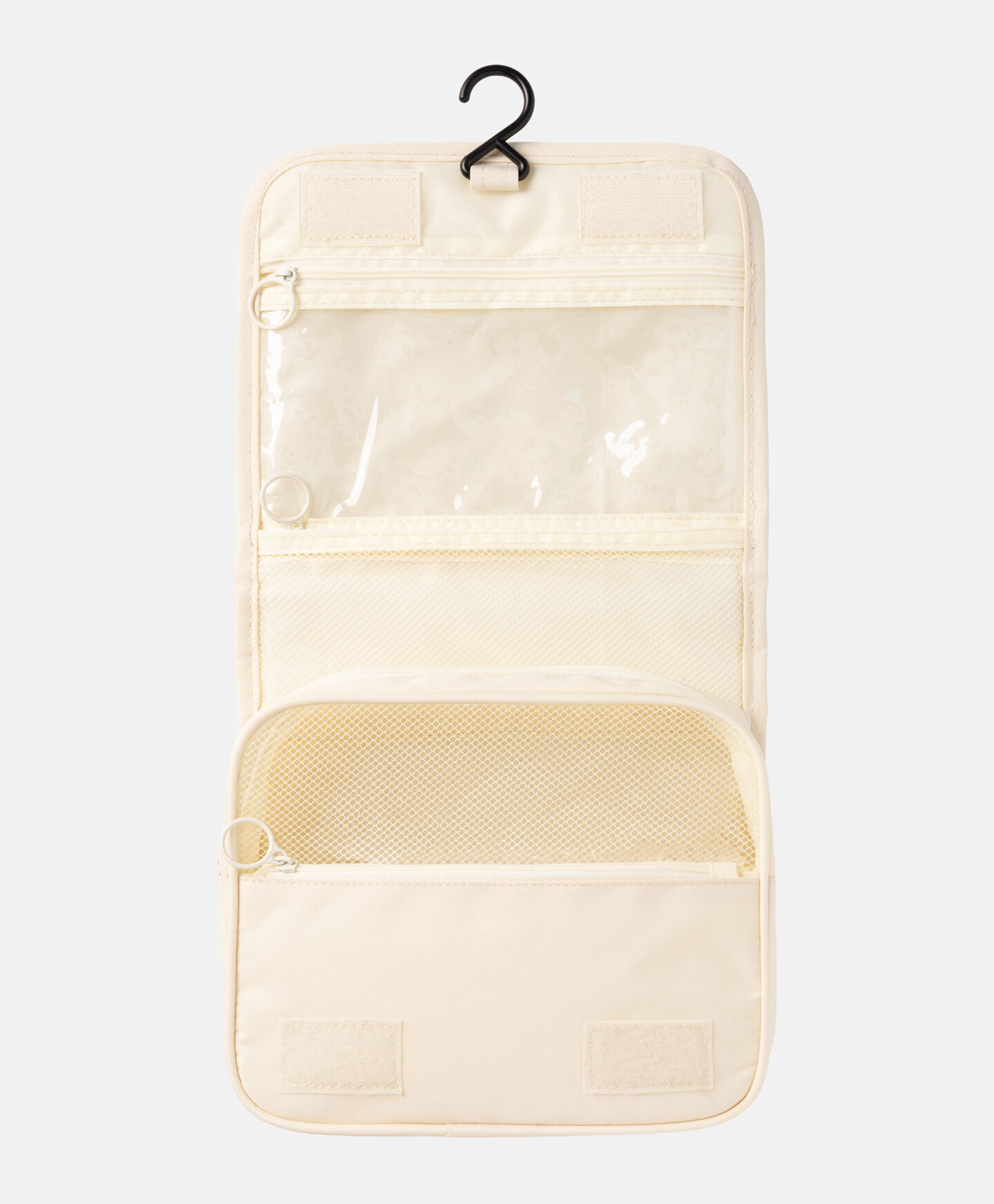 Bijela kozmetička torbica s kukom neophodan je dodatak za ljetna putovanja. Brojni pretinci, džepovi od mreže i elastične trake osiguravaju da sve ima svoje mjesto. Torbica je izrađena od materijala koji se lako čisti.