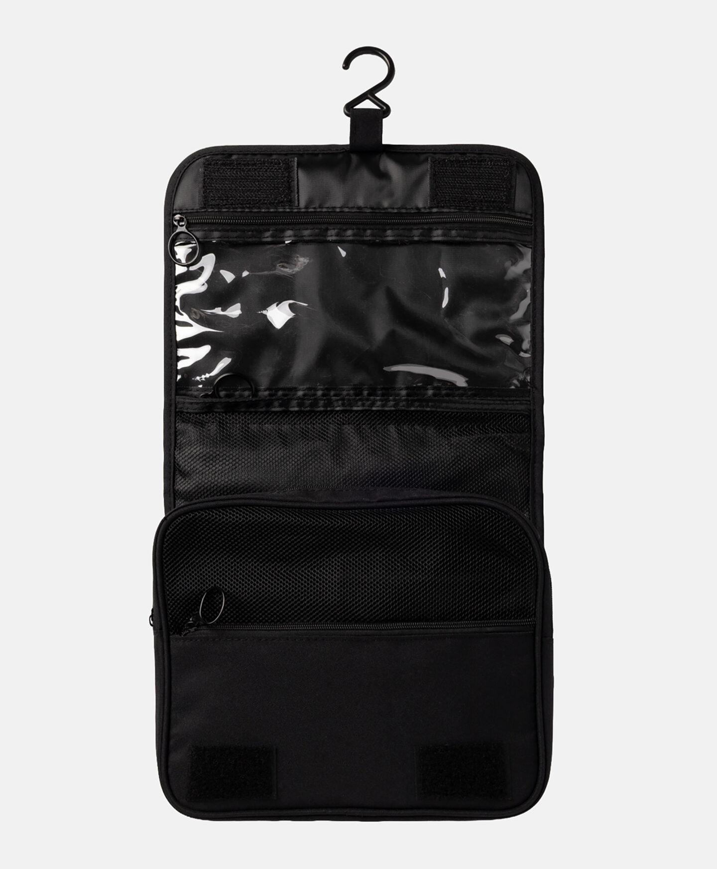 Crna kozmetička torbica s kukom neophodan je dodatak za ljetna putovanja. Brojni pretinci, džepovi od mreže i elastične trake osiguravaju da sve ima svoje mjesto. Torbica je izrađena od materijala koji se lako čisti.