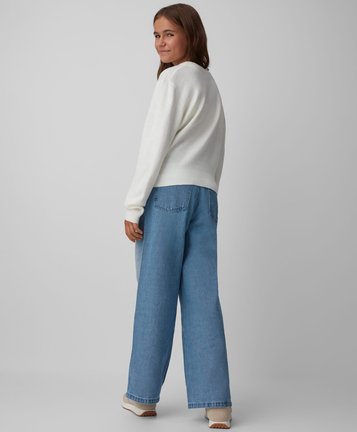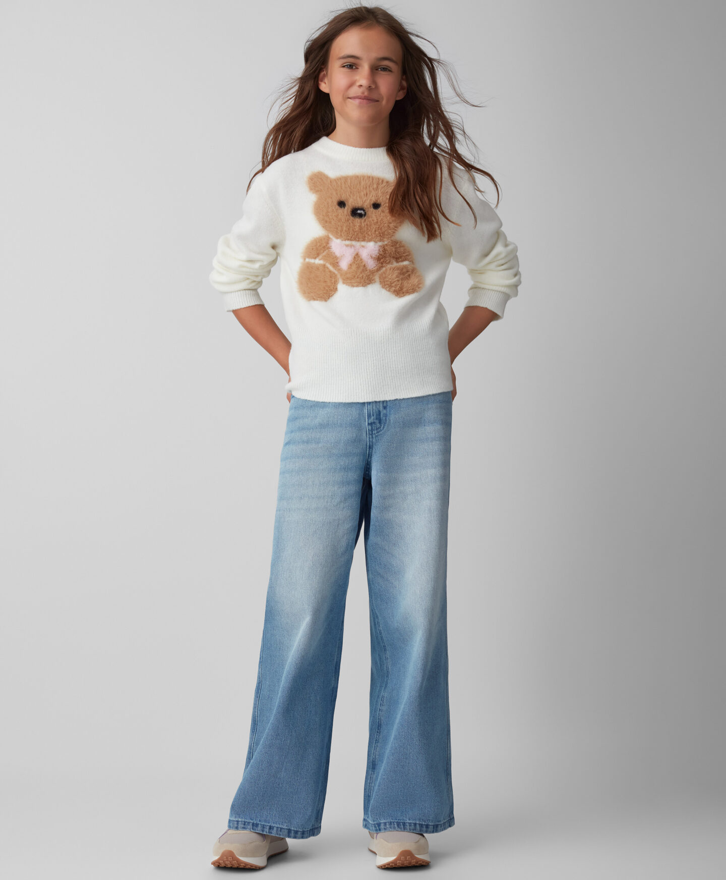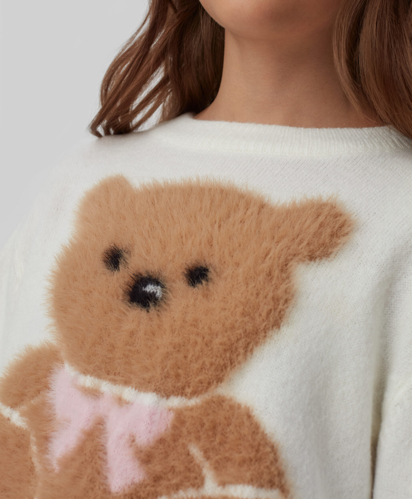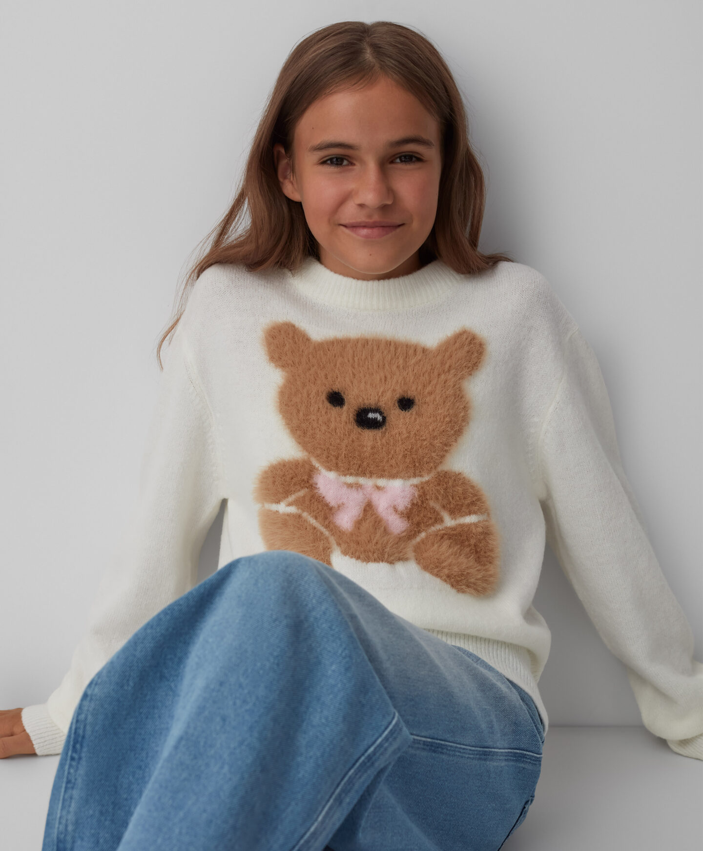 Krem pulover za djevojčice ove je jeseni/zime pravi hit! Preslatki dizajn s medvjedićem na prsima bit će dražestan dodatak svakoj odjevnoj kombinaciji. Odlično pristaje uz traperice, tajice ili suknju, što ga čini savršenim odabirom za školu.