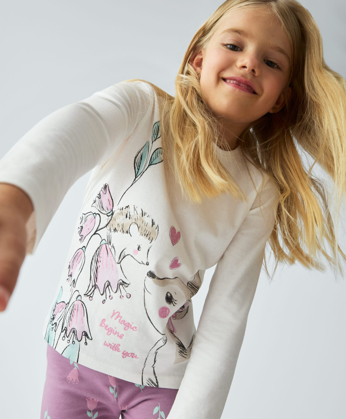 Majica dugih rukava od 100% pamuka za djevojčice ima prekrasan uzorak na prsima. Savršeno pristaje uz tajice iz iste kolekcije. Prikladna je za vrtić, školu ili ostale aktivnosti. Mekani materijal nježno grli kožu, osiguravajući toplinu vašem djetetu tijekom prohladnog jesenskog vremena. Neutralna boja uklopit će se u brojne odjevne kombinacije.