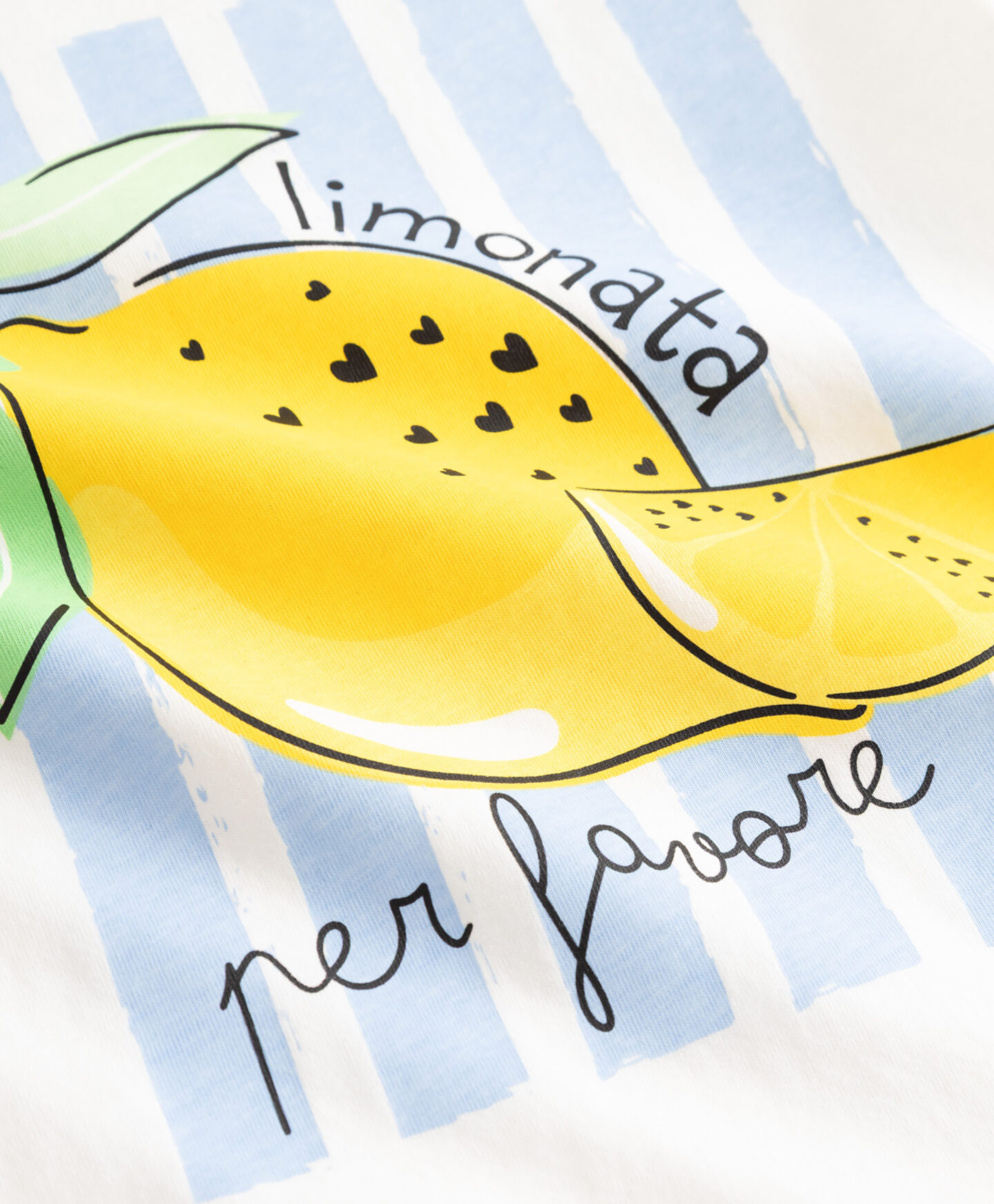 Bijela majica kratkih rukava od 100% pamuka s otiskom za djevojčice hit je ove sezone. Mekan pamuk omogućuje koži da diše i osigurava udobnost, a motiv s limunom daje svakoj odjevnoj kombinaciji posebnu dozu neodoljivosti.