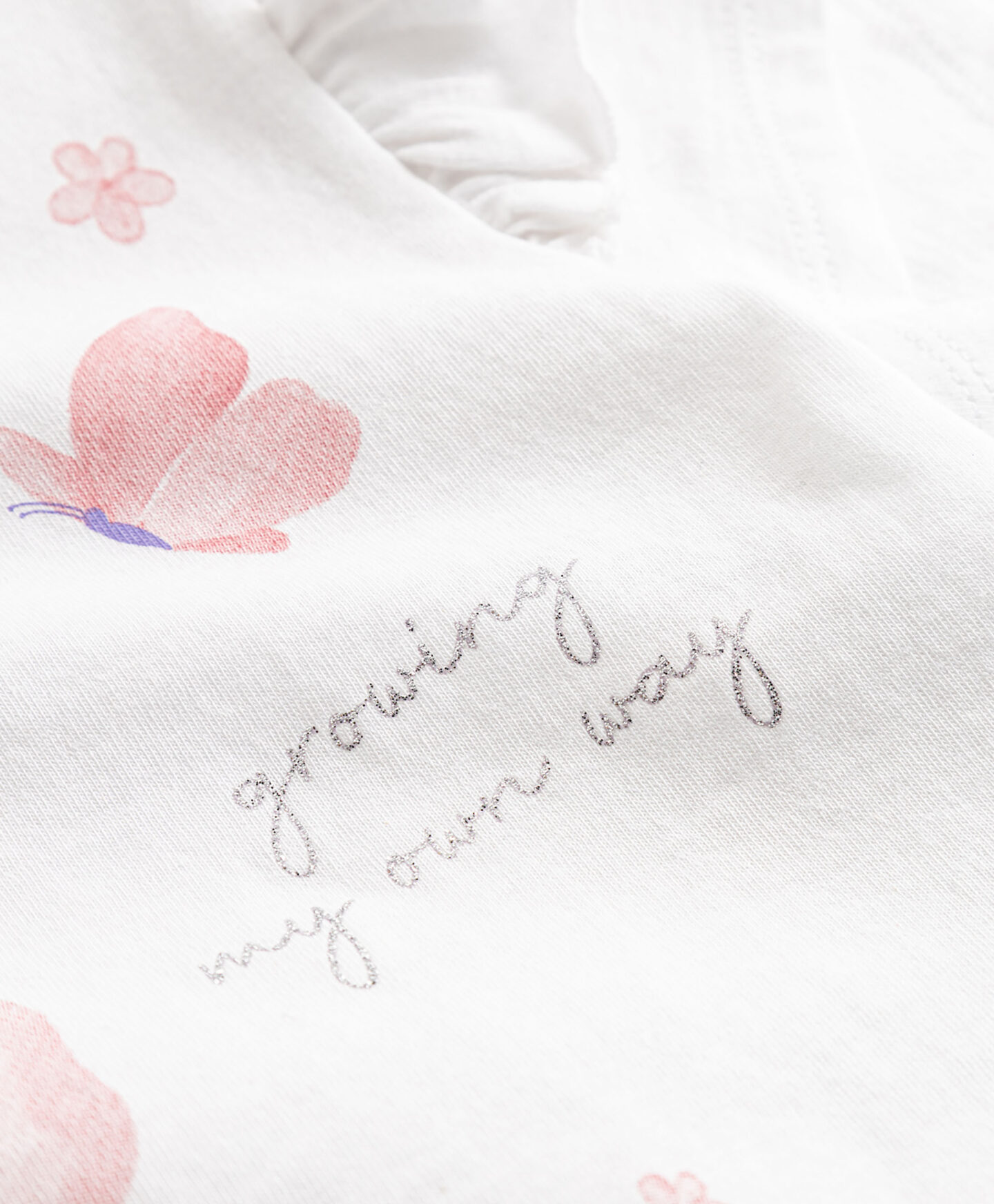 Majica kratkih rukava od 100% pamuka s motivom leptira savršena je za svaku obožavateljicu ovih nježnih insekata. Stopostotni pamuk osigurava udobnost i visoku prozračnost. Kratki rukavi idealni su za tople dane, a šarmantni volan na rukavima dodaje dašak lepršavosti i bajkovitosti. Odlično pristaje uz lepršave suknje i hlače.