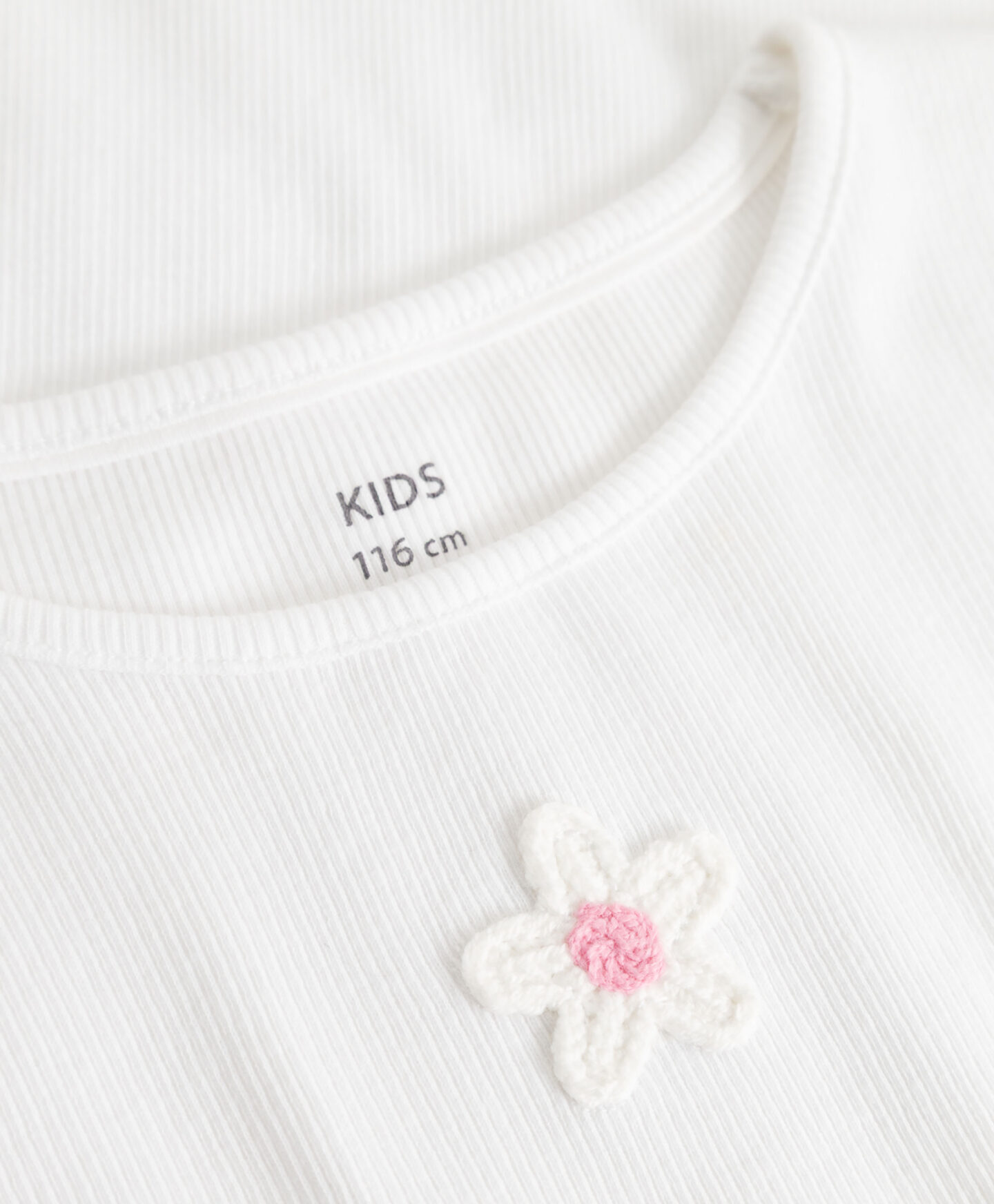 Majica kratkih rukava s prugama i vezenom aplikacijom cvijeta za djevojčice neodoljiv je odabir za male dame. Visok udio pamuka osigurava udobnost, dok elastan jamči savršeno pristajanje. Odlično pristaje uz traperice, tajice ili donje dijelove trenirki. Dizajnirana je za svakodnevne avanture pa neće sputavati kretanje tijekom igranja na igralištu ili vožnje bicikla. Idealna je za svaku prigodu.