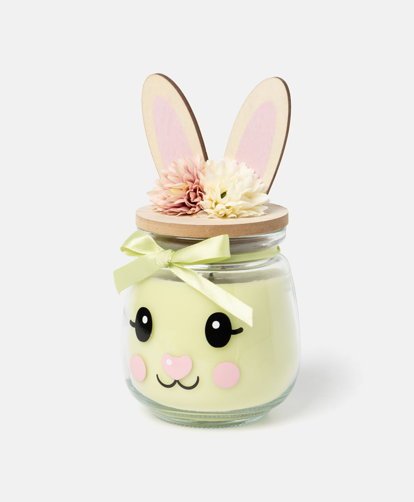 Zelena mirisna svijeća u staklenoj posudi ima ukrasni poklopac s 3D ušima. Motiv zeca neodoljiv je i sigurno će se svidjeti najmlađim članovima obitelji. Dugo gori i širi prekrasan miris vašim domom. Dostupna su tri dizajna.