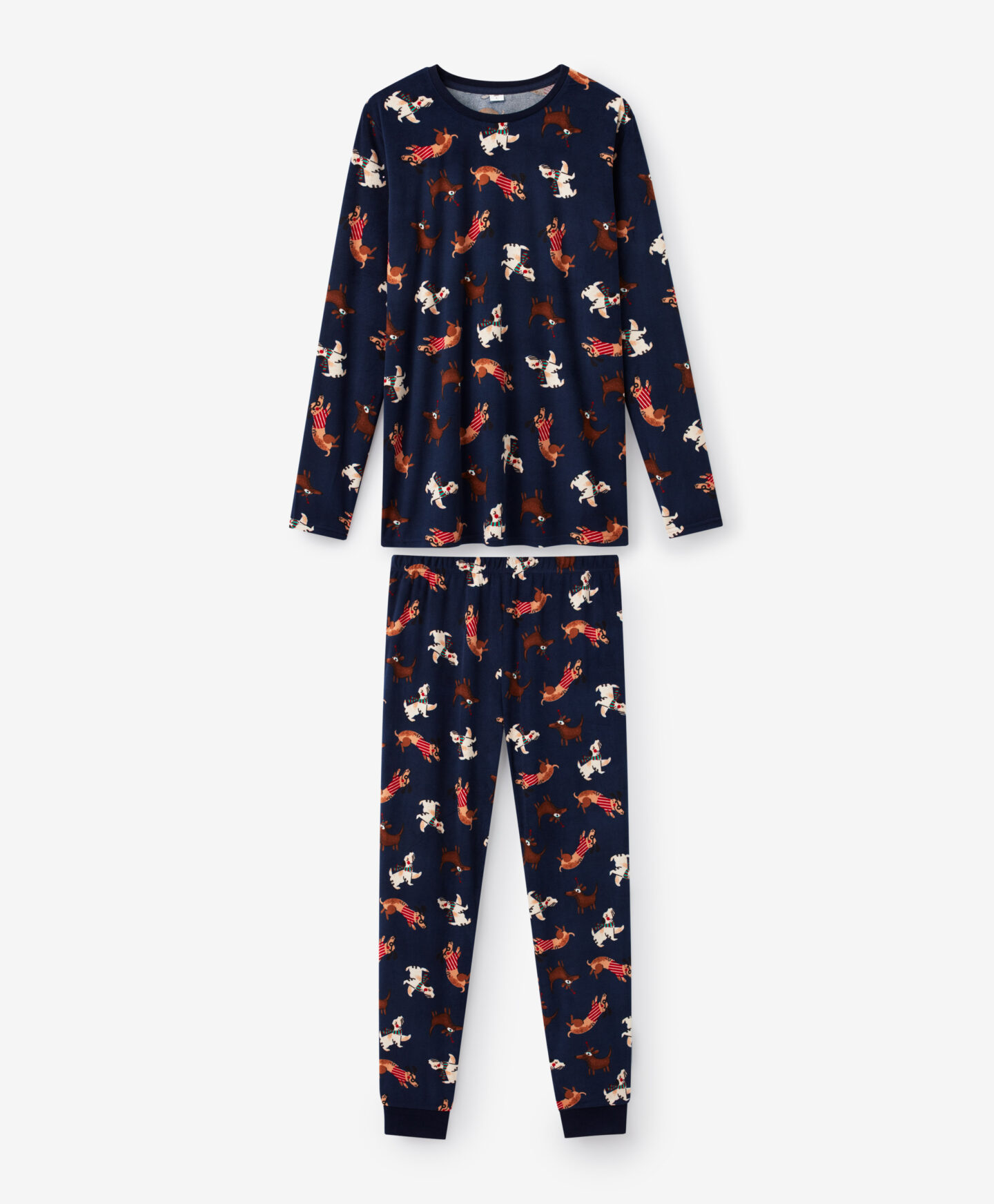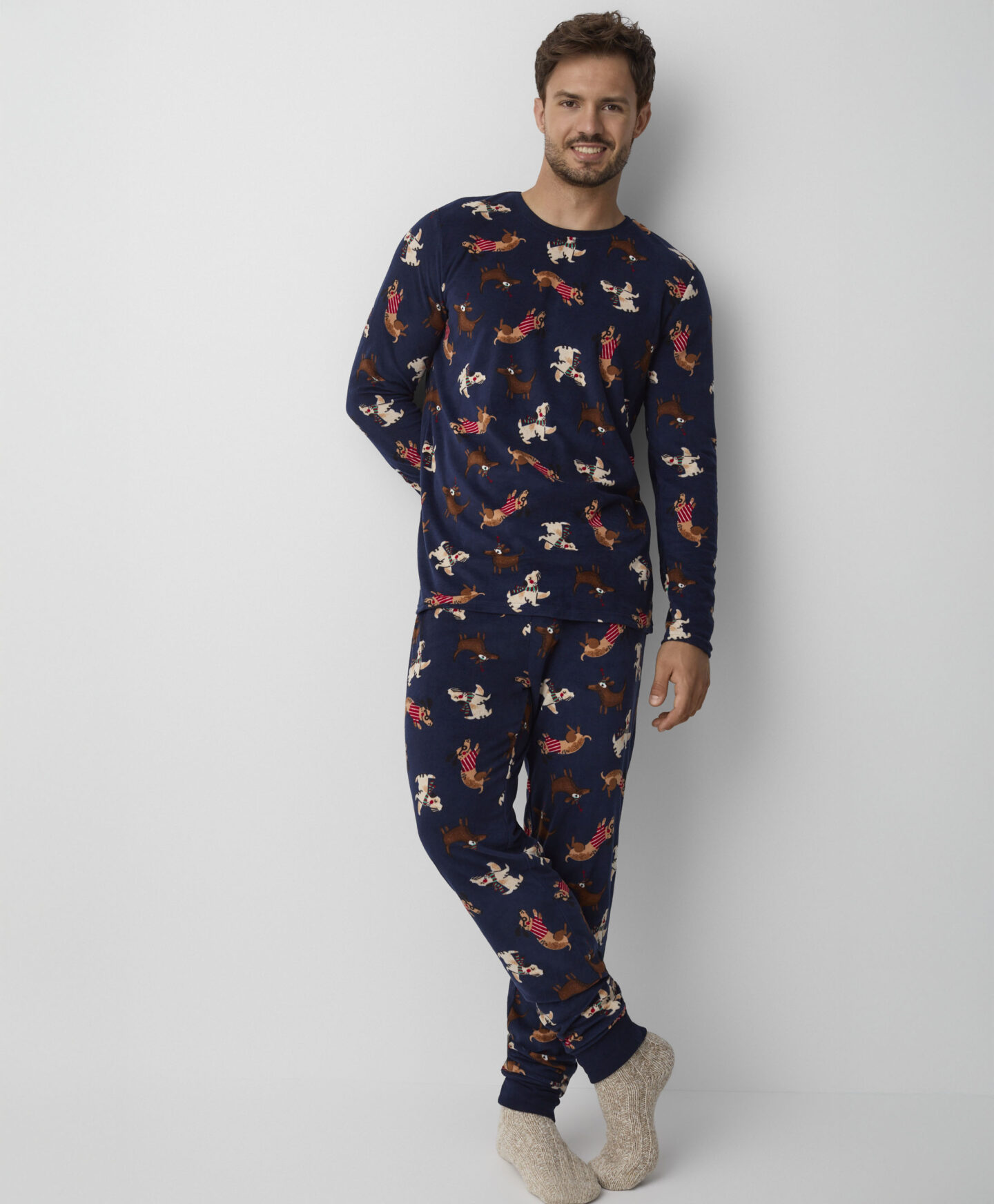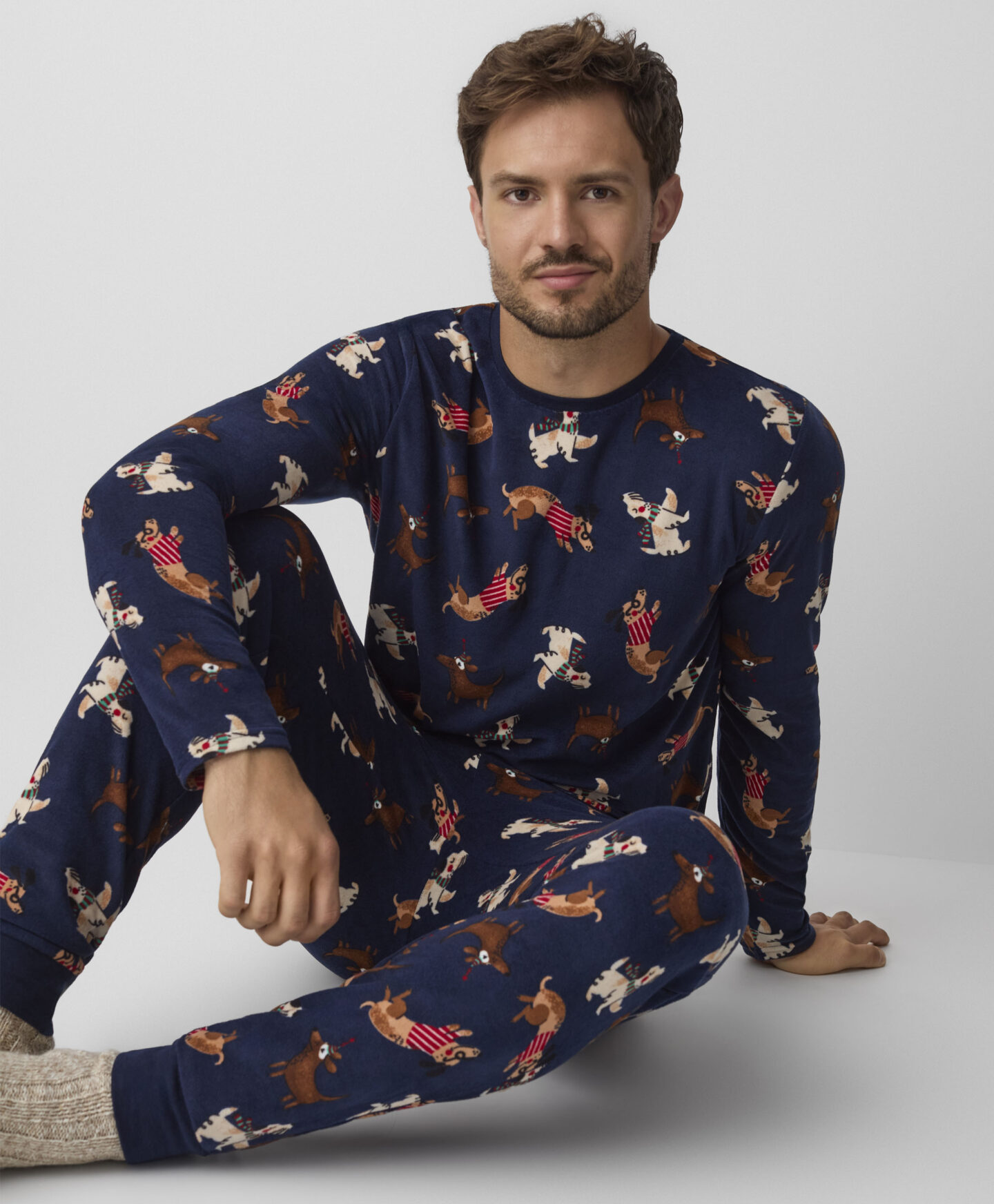 Muška pidžama od velura sa psima idealna je za hladnije dane. Napravljena je od mekanog velura koji je ugodan na dodir pa pruža toplinu i udobnost tijekom spavanja. Zbog razigranog motiva sa psima svi će je htjeti nositi prije spavanja. Idealna je za ljubitelje ovih četveronožnih prijatelja.