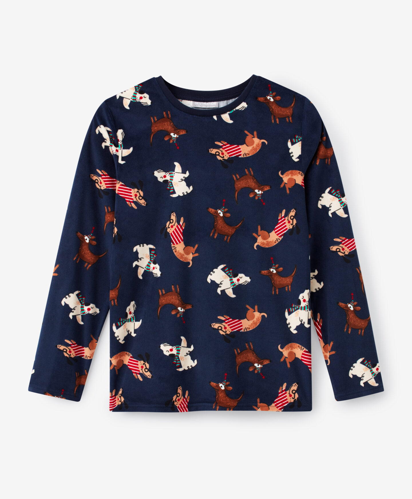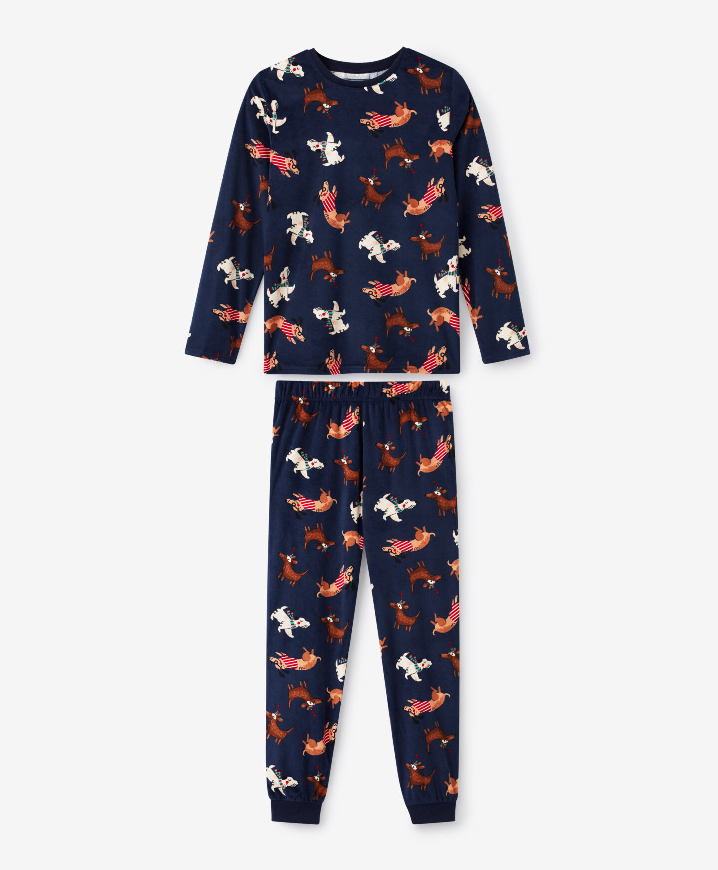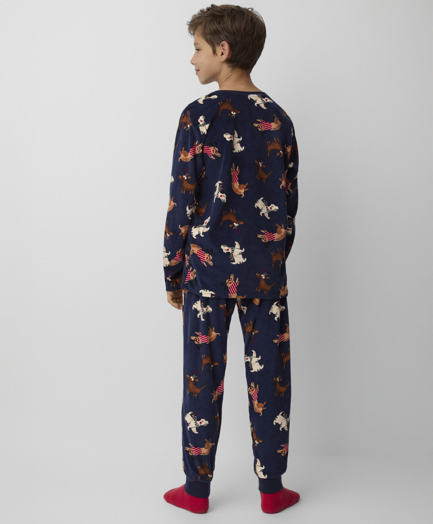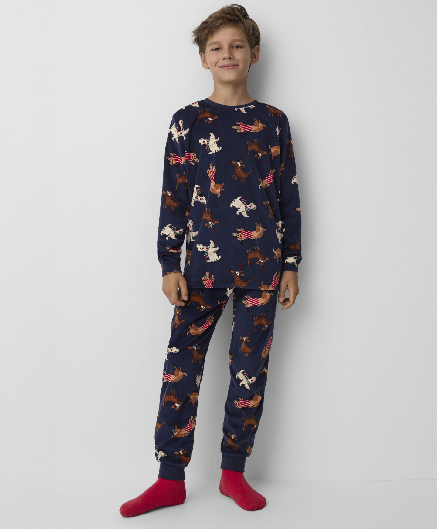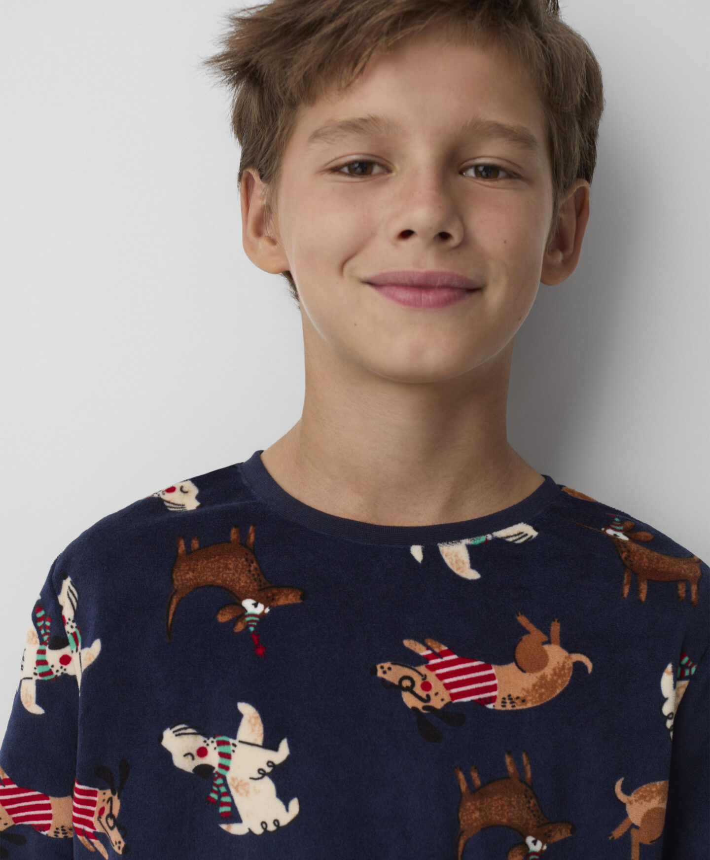 Pidžama od velura sa psima za dječake pruža udobnost za spavanje i slobodu kretanja. Izrađena od mekog velura koji je ugodan na dodir pa je idealna za hladnije noći. Jamči toplinu i udobnost. Zbog razigranog motiva sa psima svaki će je dječak htjeti nositi prije spavanja.