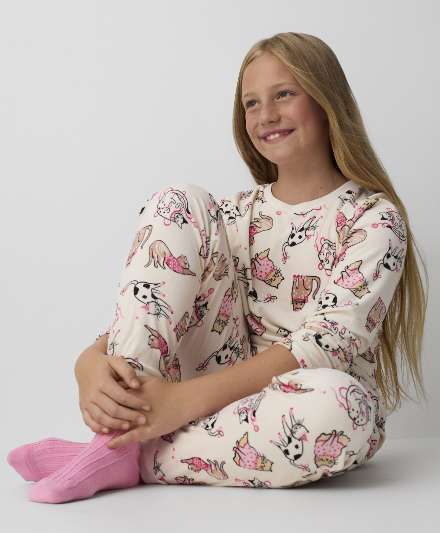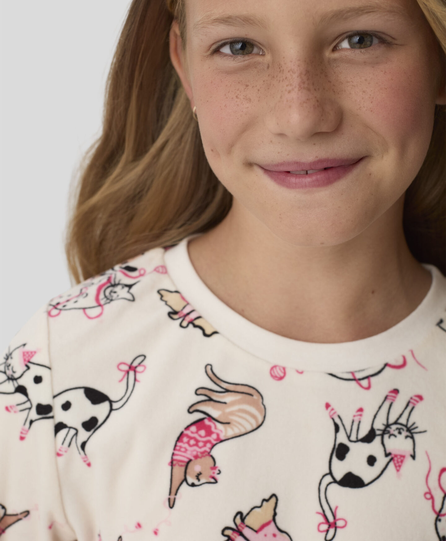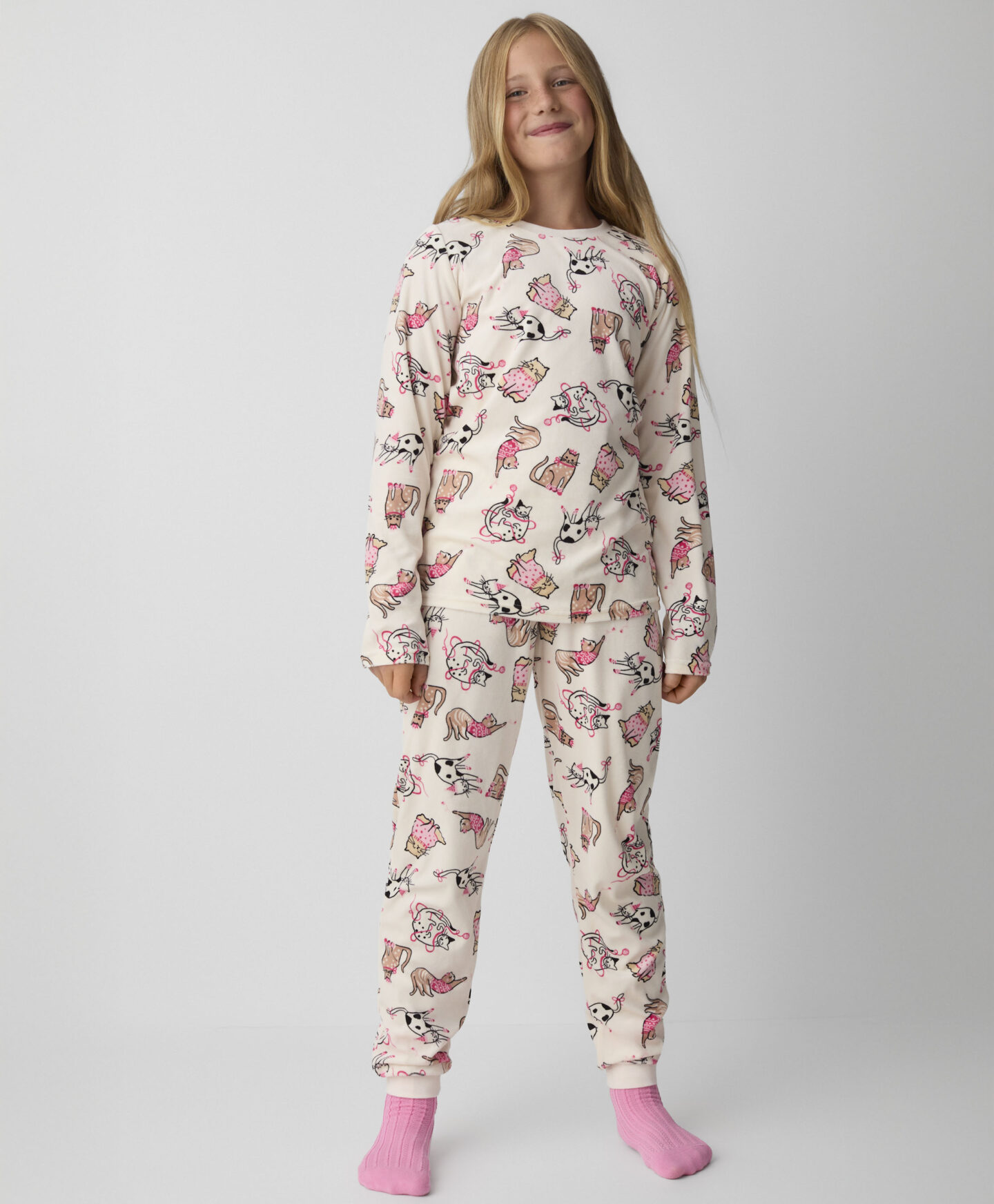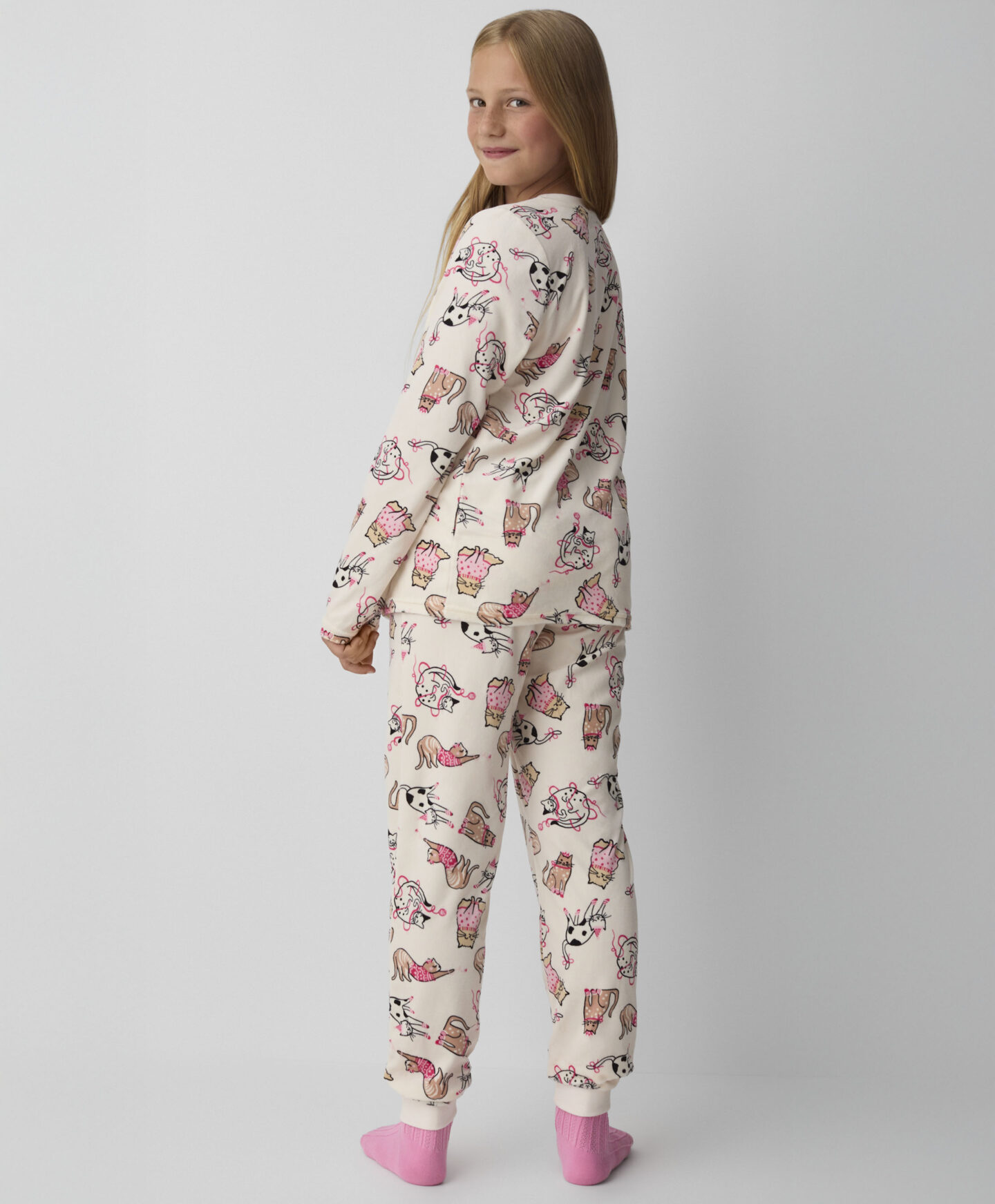 Pidžama od velura s mačkama za djevojčice pruža udobnost i slobodu kretanja tijekom spavanja. Zbog razigranog motiva s mačkama svaka će je djevojčica htjeti nositi prije spavanja. Idealna je za hladnije noći jer obavija vaše mališane toplinom. Odličan je izbor za ljubiteljice mačaka.