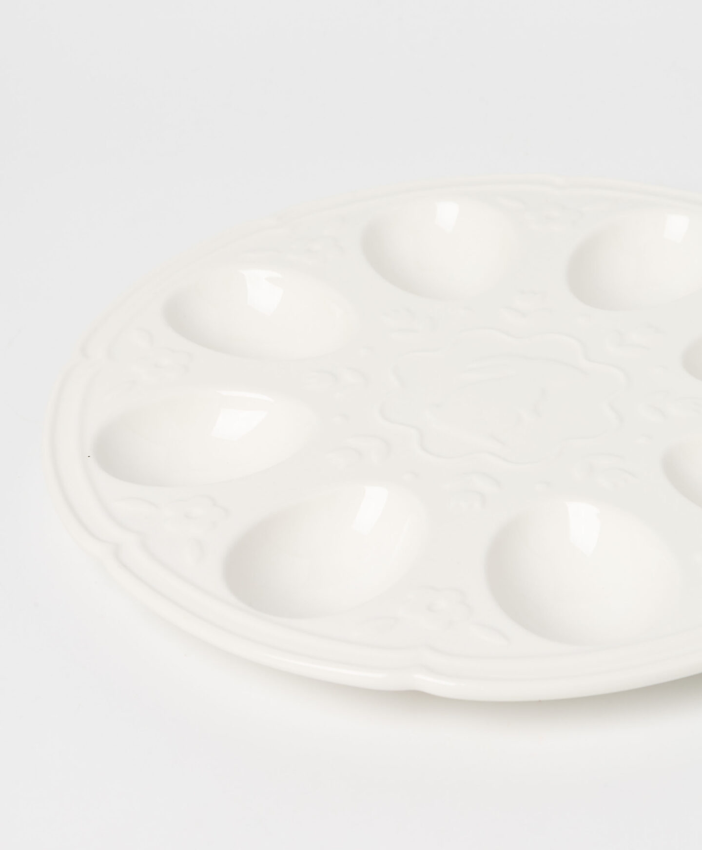 Porculanski pladanj za jaja savršen je za posluživanje uskršnjeg doručka. Elegantan je način posluživanja punjenih, tvrdo kuhanih ili meko kuhanih jaja. Također može poslužiti kao šarmantna dekoracija stola ili za prezentaciju ručno ukrašenih uskršnjih jaja.