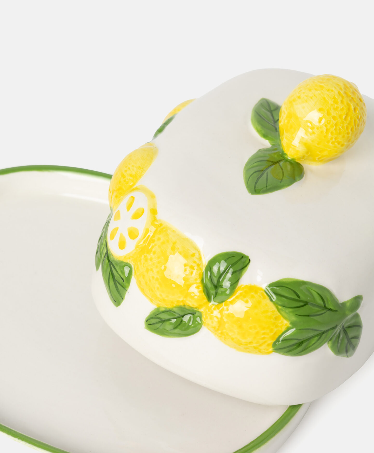 Posuda za maslac od dolomita s reljefnim motivom limuna donijet će ljetni ugođaj u vašu kuhinju! Posuda ima poklopac koji štiti maslac te čuva njegovu svježinu i okus. Savršena je za svakodnevnu upotrebu u kuhinji. Dolomit je izdržljiv materijal, otporan na ogrebotine i toplinu, što jamči da će vas posuda oduševljavati svojim dizajnom dugi niz godina.