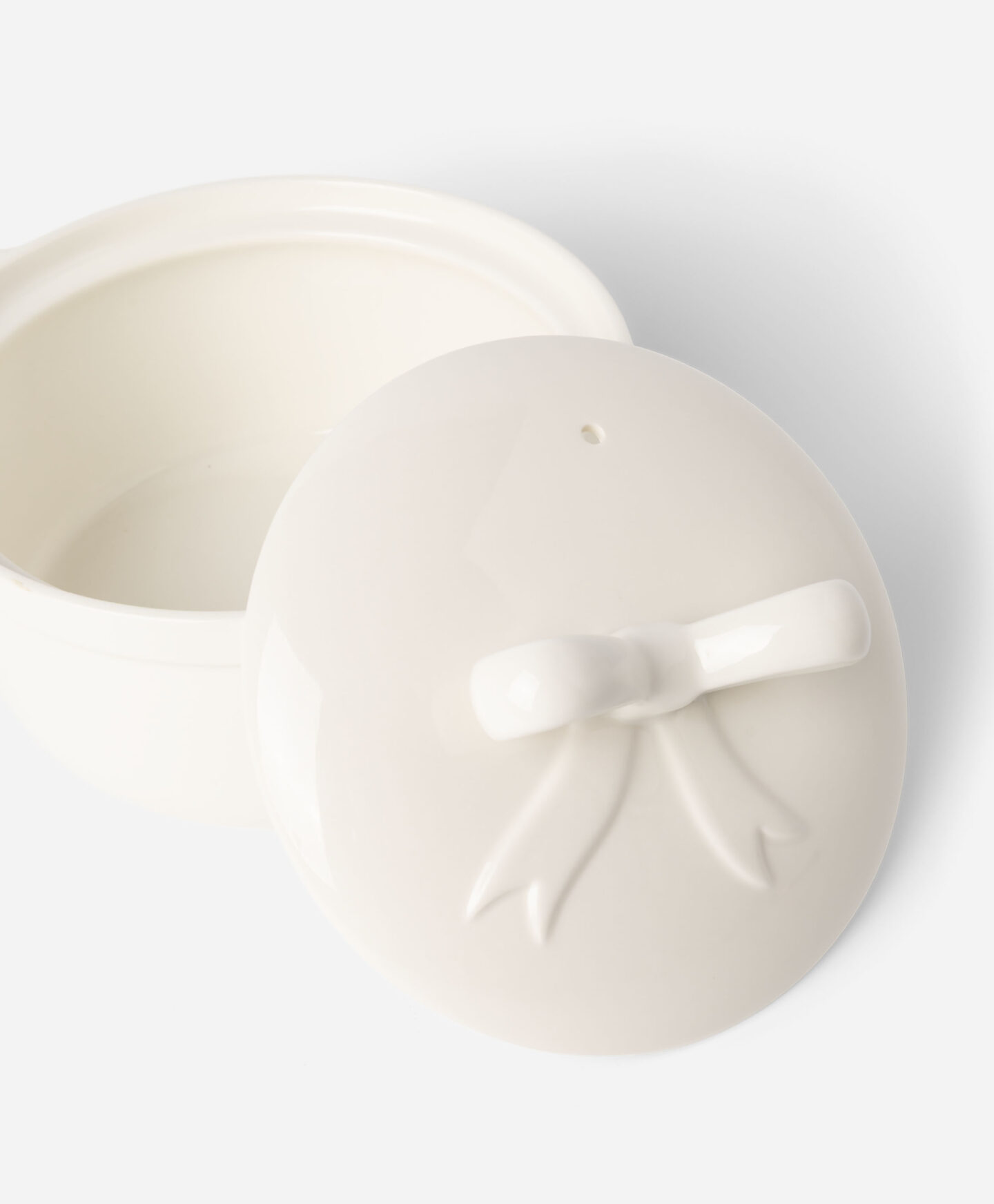 Posuda za pečenje s poklopcem i ukrasnom mašnom savršena je za pripremu i posluživanje složenaca, deserata i raznih drugih jela. New Bone porculan osigurava ravnomjernu raspodjelu topline pa će vaši kulinarski pothvati sigurno biti uspješni. Poklopac s ukrasnom mašnom čini posudu posebnom i donosi dašak elegancije na svaki stol.