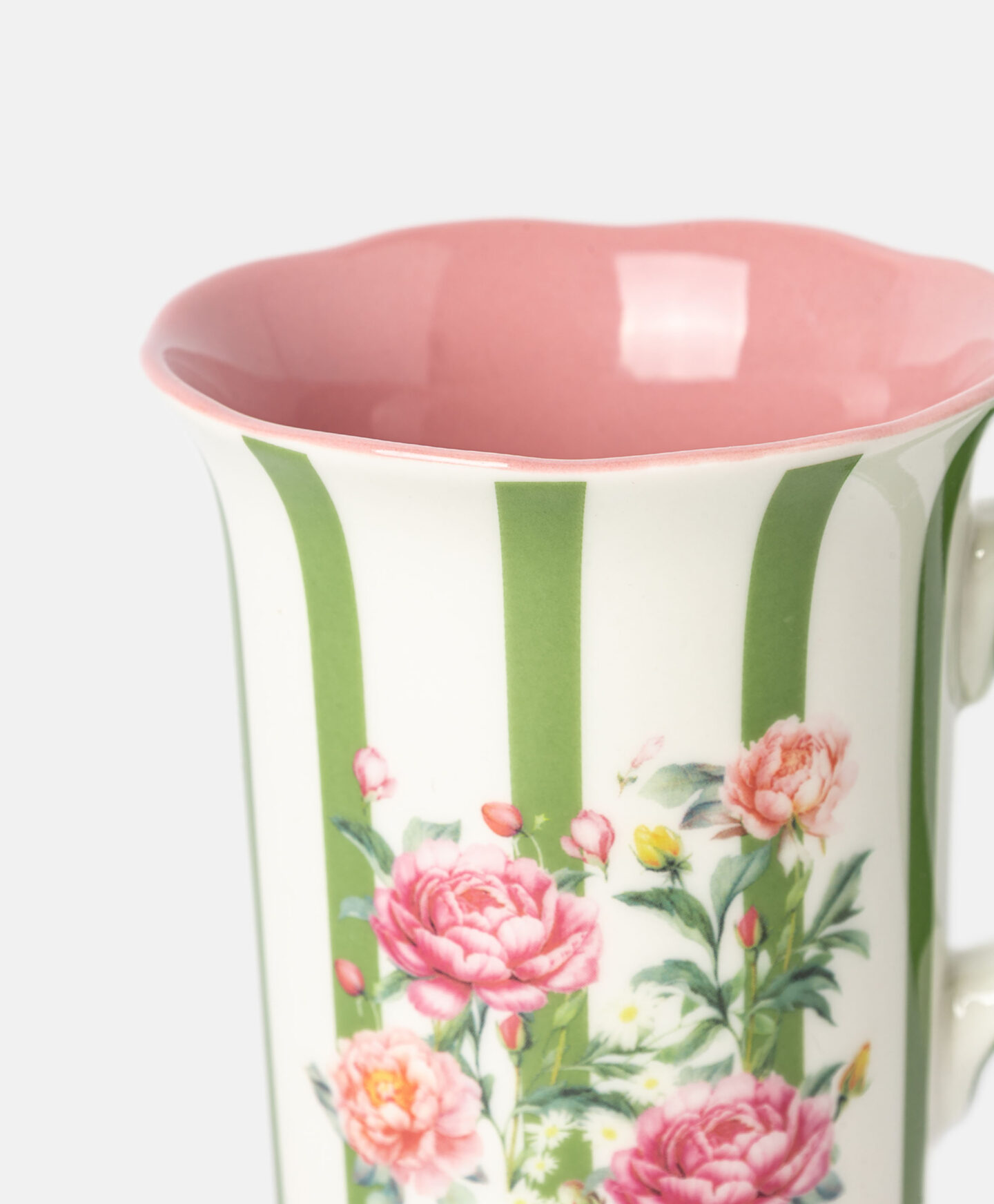 Šalica sa zelenim prugama i motivom cvijeća uveselit će svaki trenutak proveden uz vaš omiljeni napitak. Cvjetni motiv unosi dašak proljeća u vaš dom i uz njega svaki gutljaj aromatične kave ima još bolji okus! Šalica je odlična za pripremu jutarnje kave, popodnevnog čaja ili kakaa. Također je izvrsna ideja za poklon. U našoj ponudi dostupna su dva motiva.
