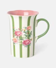 Šalica sa zelenim prugama i motivom cvijeća uveselit će svaki trenutak proveden uz vaš omiljeni napitak. Cvjetni motiv unosi dašak proljeća u vaš dom i uz njega svaki gutljaj aromatične kave ima još bolji okus! Šalica je odlična za pripremu jutarnje kave, popodnevnog čaja ili kakaa. Također je izvrsna ideja za poklon. U našoj ponudi dostupna su dva motiva.
