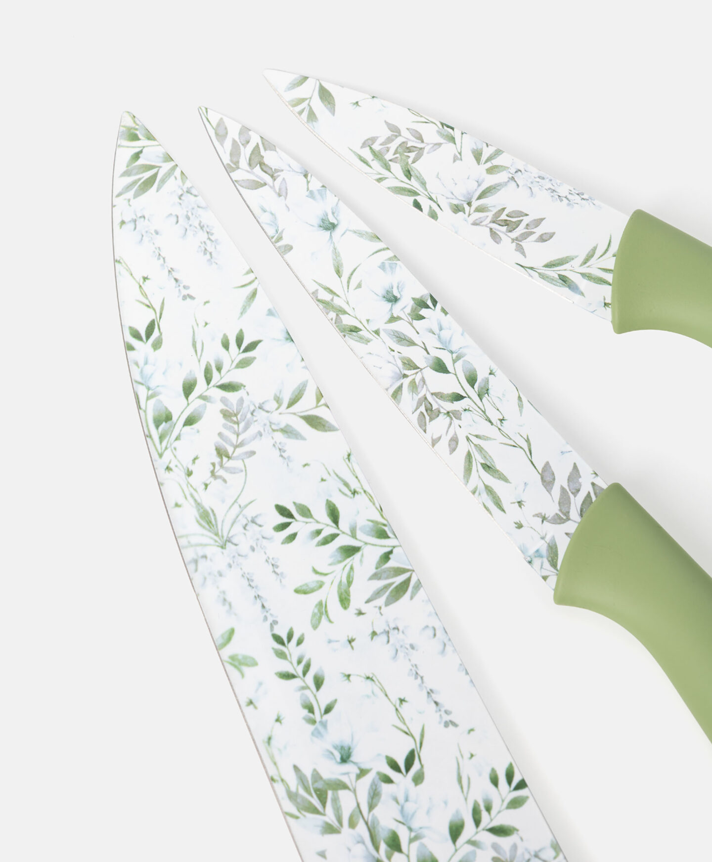 Set noževa sastoji se od 3 komada različitih veličina koji će unaprijediti vaše svakodnevno kuhanje. Odlični su za rezanje mesa, ribe, povrća i voća, kao i za sjeckanje začinskog bilja. Nehrđajući čelik dugo zadržava oštrinu, lako se čisti i otporan je na svakodnevnu upotrebu. Ergonomska drška u pastelno zelenoj boji i oštrica ukrašena proljetnim uzorkom unose boju u vašu kuhinju. U ponudi se nalaze i odgovarajuće daske za rezanje.