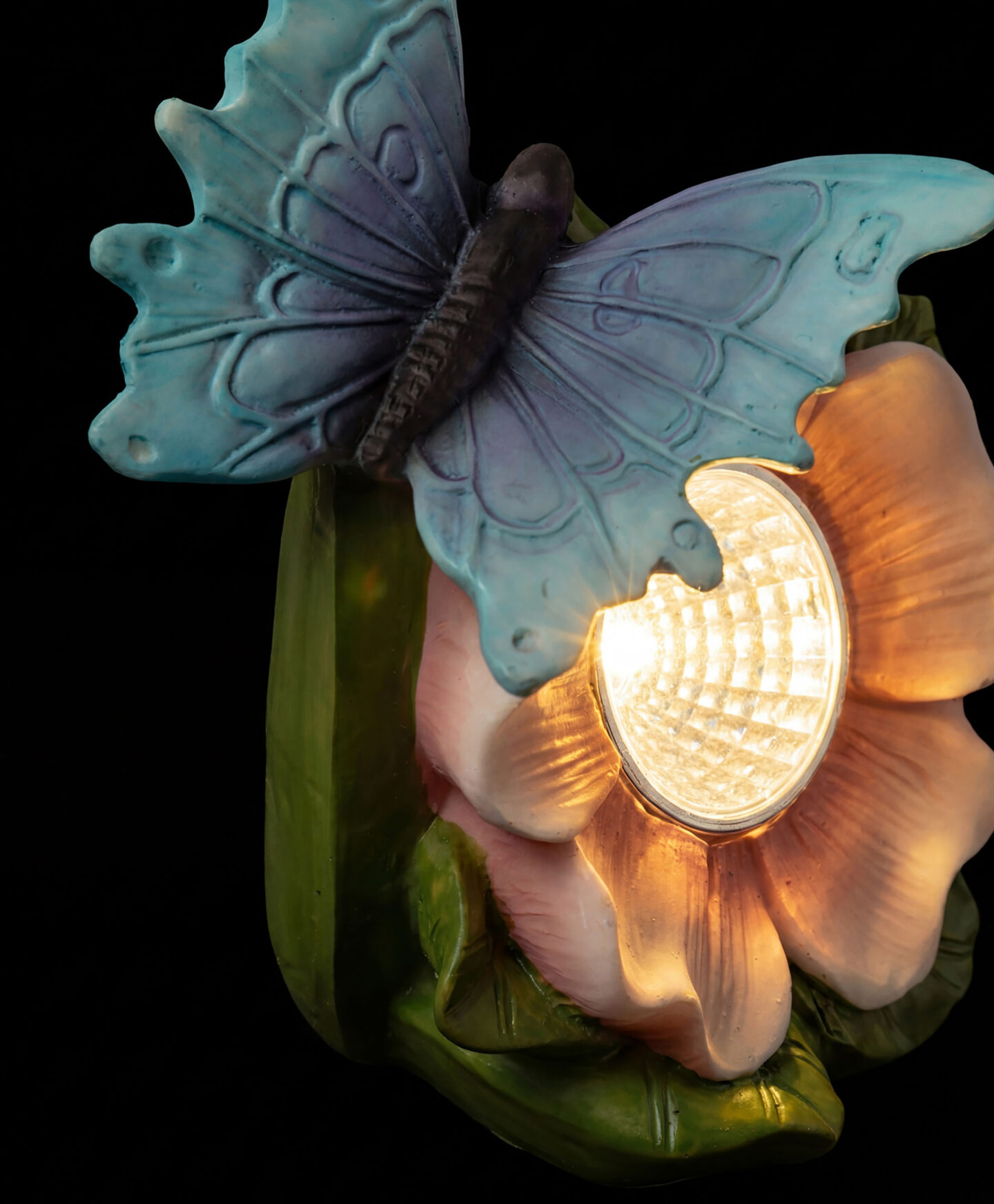 Solarna lampa s cvijetom i leptirom jedinstvena je vrtna dekoracija. Napaja se sunčevom energijom zahvaljujući ugrađenoj solarnoj ploči pa radi bez kablova i baterija. Proljetni dizajn s nježnim cvijetom i leptirima privlači pažnju, a nježno LED svjetlo stvara ugodnu atmosferu u svakom vrtu, na balkonu ili terasi. Lampa se uključuje u sumrak i isključuje u zoru, osiguravajući automatsko osvjetljenje cijelu noć. U ponudi je dostupno više motiva.