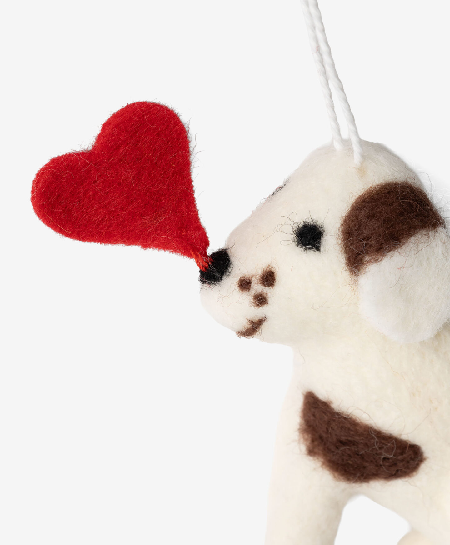 Ukras od filca u obliku psa koja drži srce neodoljiv je ukras za Valentinovo. Malen je i mekan pa je savršen za vješanje na ključeve, torbe, ruksake ili pernice. Dodaje dašak boje svakom trenutku i pomaže vam da izrazite svoje osjećaje prema osobi koju darujete. Dostupna su dva dizajna.