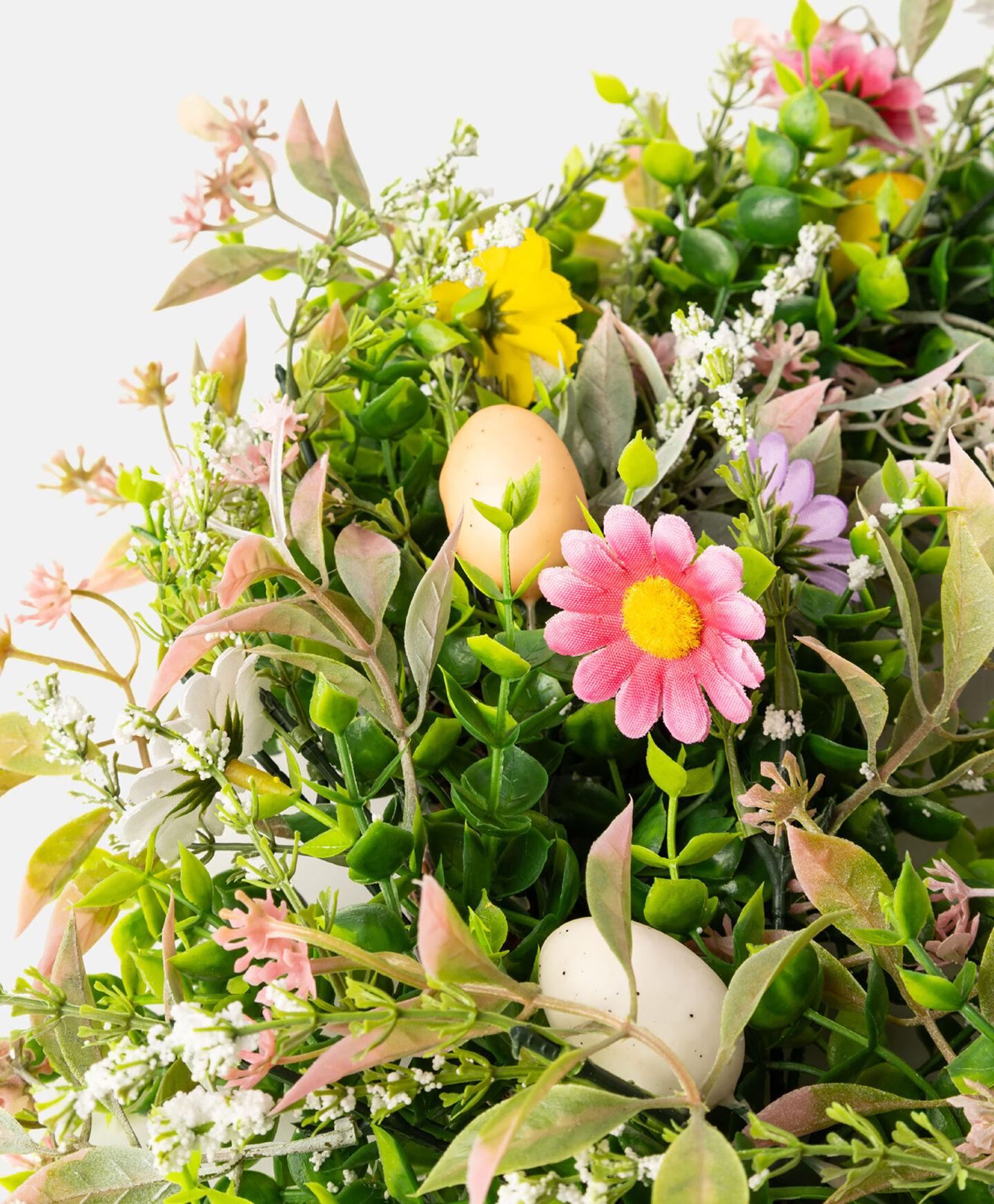 Uskršnji vijenac s jajima i cvijećem odiše proljećem. Jedinstvena je dekoracija koja savršeno funkcionira kao ukras za vrata, ali je i prekrasan dodatak dnevnom boravku, radnom prostoru ili dekorativan detalj na uskrsnim zabavama i proslavama. Također je izvrsna ideja za poklon za one koji vole jedinstvene dodatke.