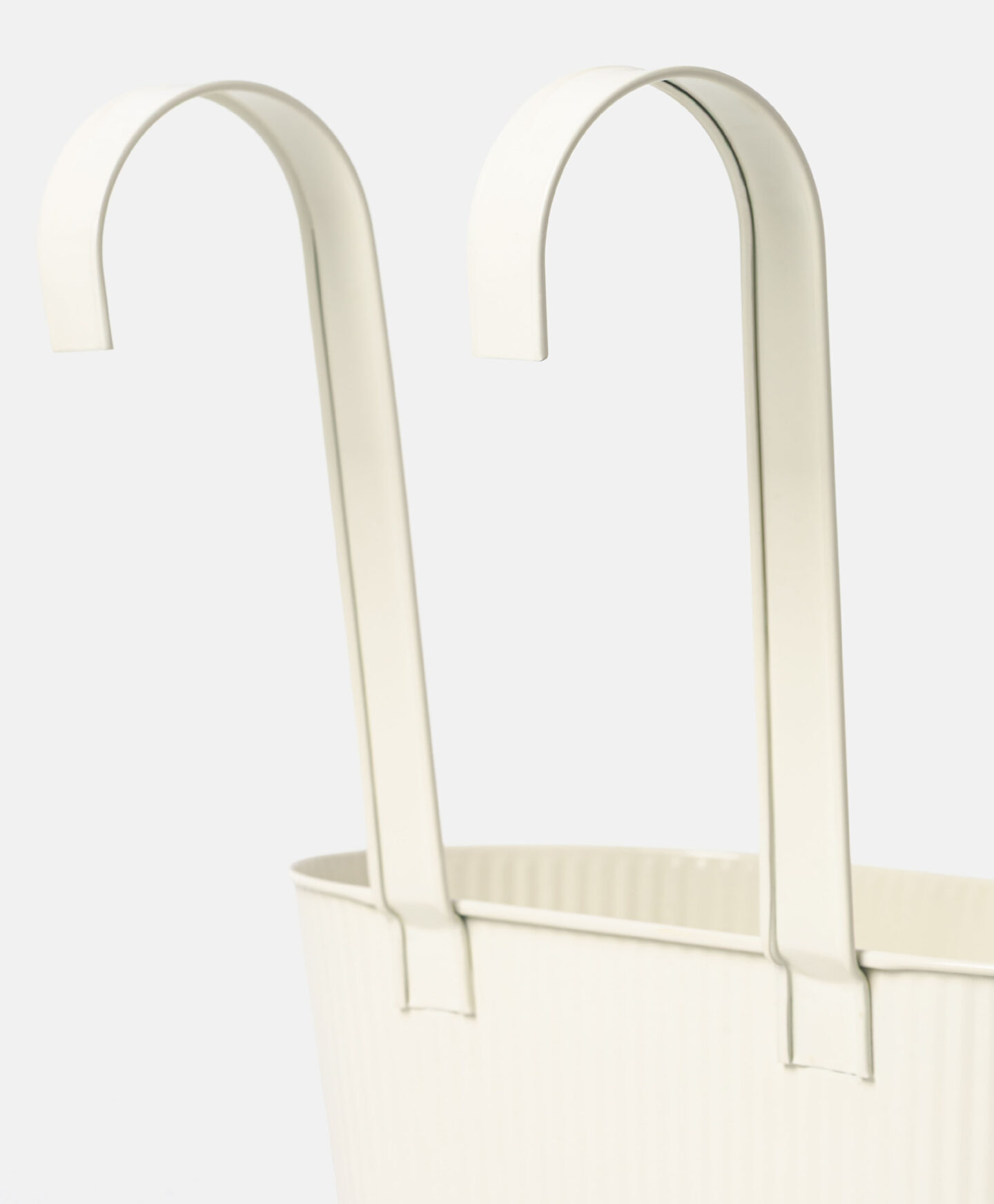 Bijela viseća posuda za biljke s rebrastim stijenkama osvojit će vas svojim proljetnim dizajnom. Praktične kuke za vješanje omogućuju vam da posudu za cvijeće postavite na balkonsku ogradu ili pregradu, čime izvrsno iskorištavate prostor. U ponudi su dostupni različiti motivi.