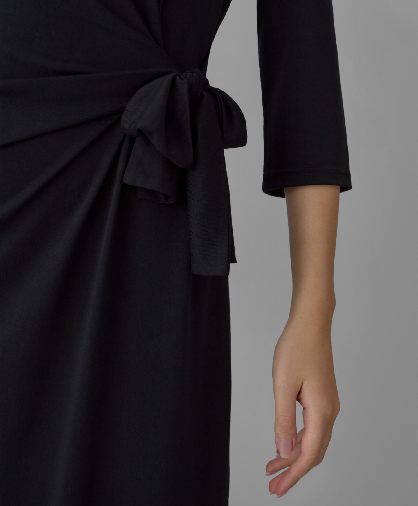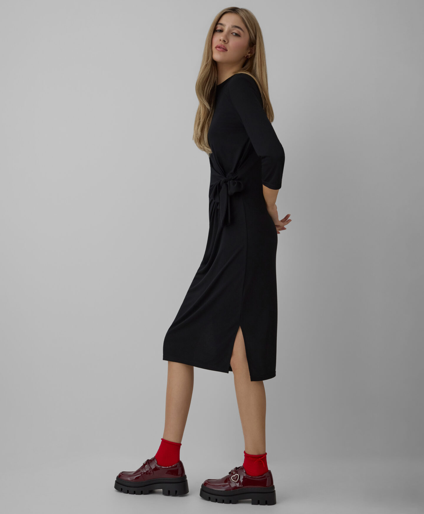 Ženska haljina s vezicom u struku izrađena od tkanine s viskozom odličan je izbor za posebne prigode. Klasična crna boja dodat će dašak elegancije svakoj odjevnoj kombinaciji. Haljina je mekana na dodir i lijepo naglašava figuru. Možete ju kombinirati s elegantnim cipelama na petu ili čizmama.