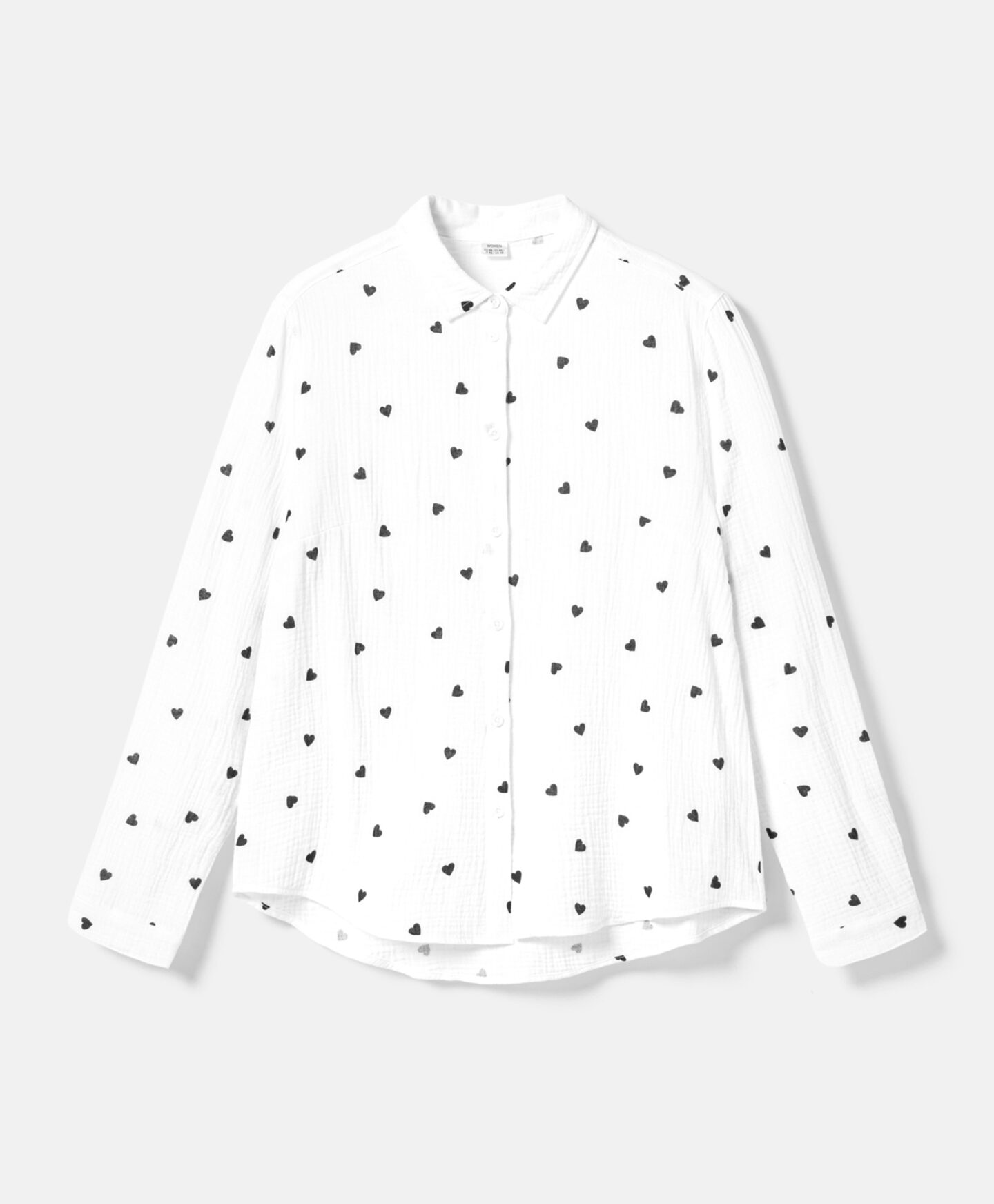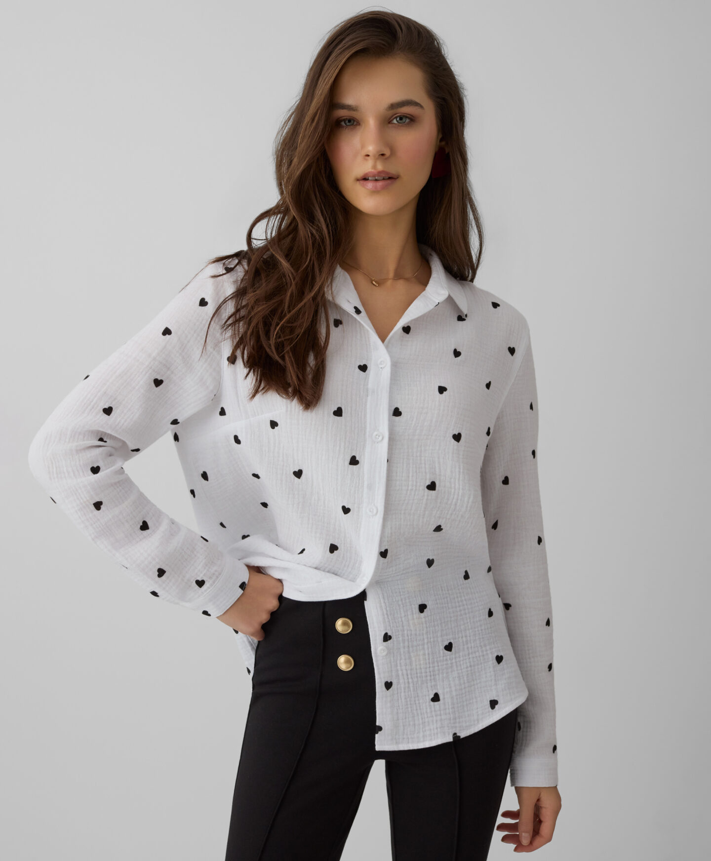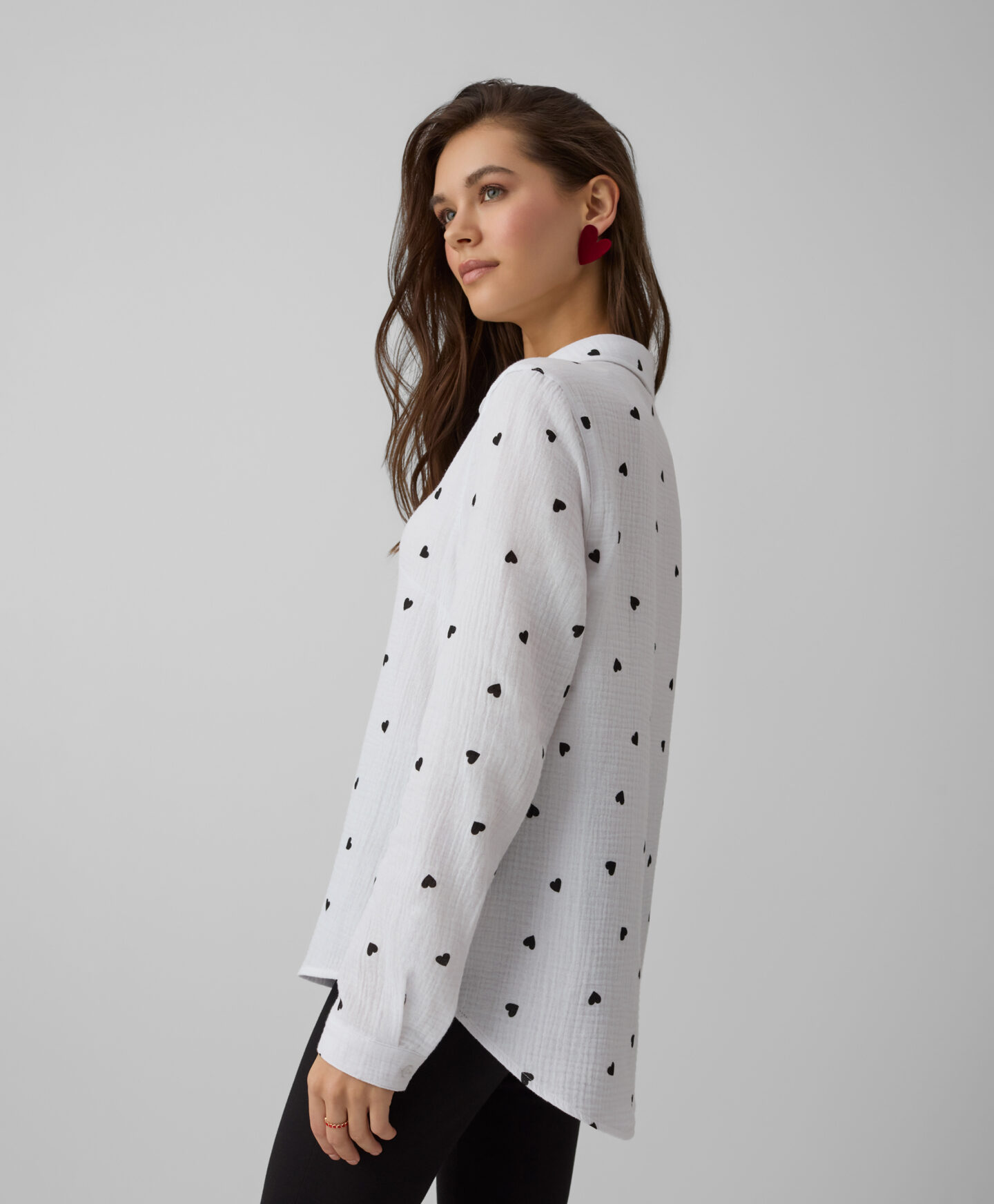 Ženska košulja od 100% pamuka s nježnim motivom osvojit će ljubiteljice klasičnog stila. Muslin je lagan, prozračan i nevjerojatno mekan na dodir, što ovu košulju čini savršenom za razne prigode. Njezin minimalistički dizajn odlično pristaje različitim odjevnim kombinacijama, od ležernih do elegantnih.