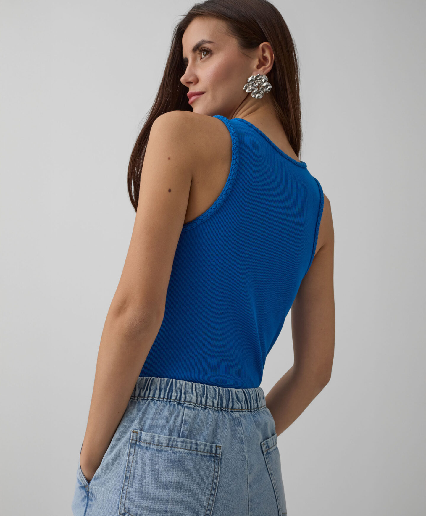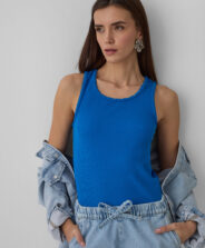 Ženska majica bez rukava u bijeloj boji baza je svake moderne odjevne kombinacije. Univerzalni dizajn koji nikada ne izlazi iz mode savršeno se uparuje s raznim komadima iz vašeg ormara – od hlača do suknji. Mekana, lagana tkanina osigurava udobnost tijekom cijelog dana, bez obzira na godišnje doba. U kolekciji su dostupne dvije boje.
