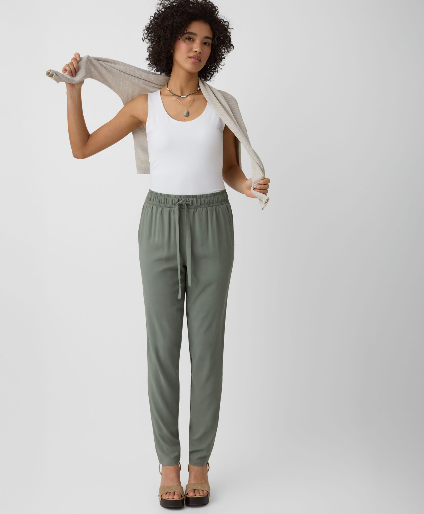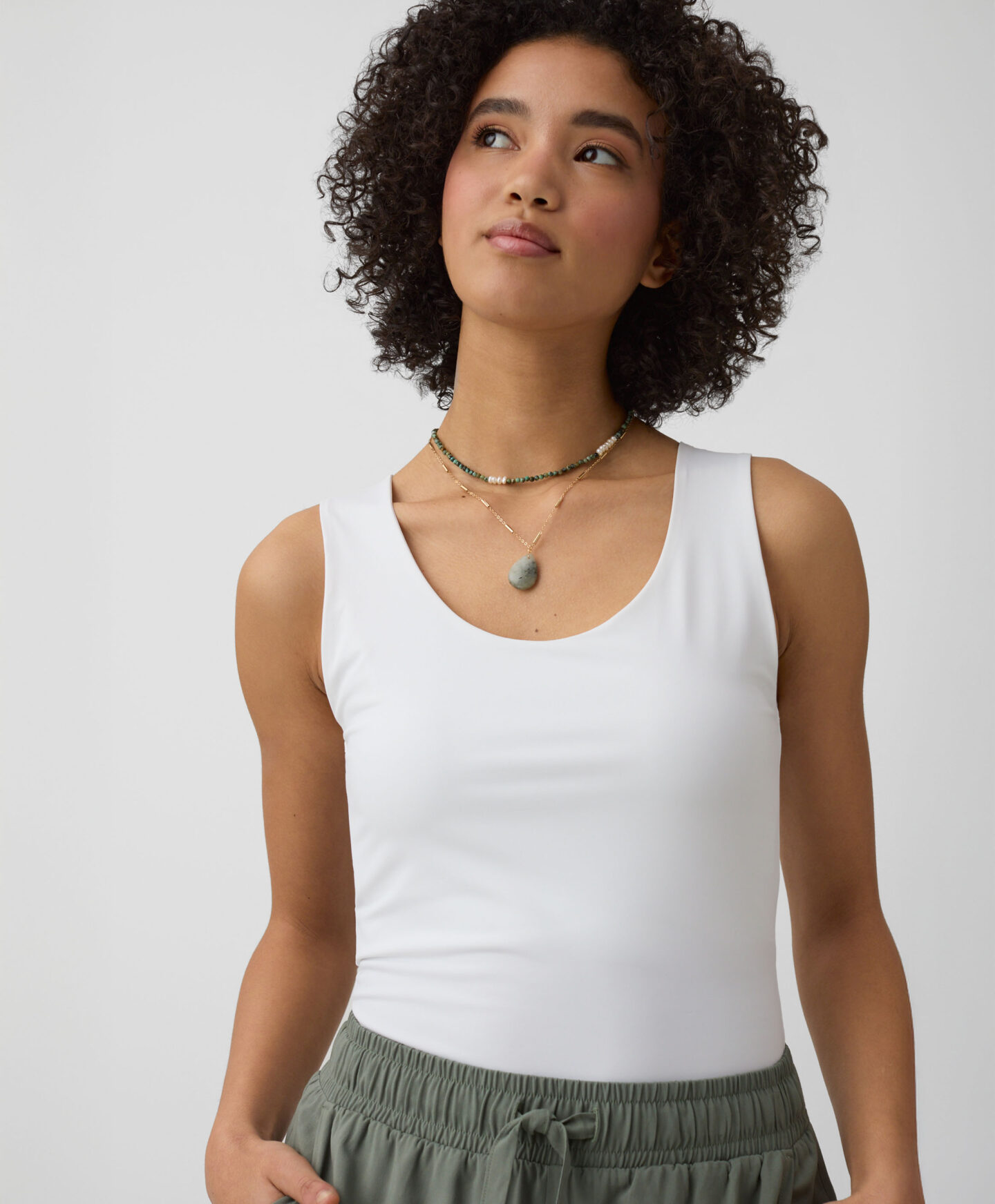 Bijela ženska majica bez rukava nevjerojatno je svestrana. Odlično pristaje uz traperice, chino hlače, kratke hlače ili donje dijelove trenirke. Možete je nositi ispod jakne ili pulovera. Glatka tekstura i jednostavan dizajn čine ovu majicu bez rukava odličnom bazom za sve odjevne kombinacije. Dostupna je u tri boje.