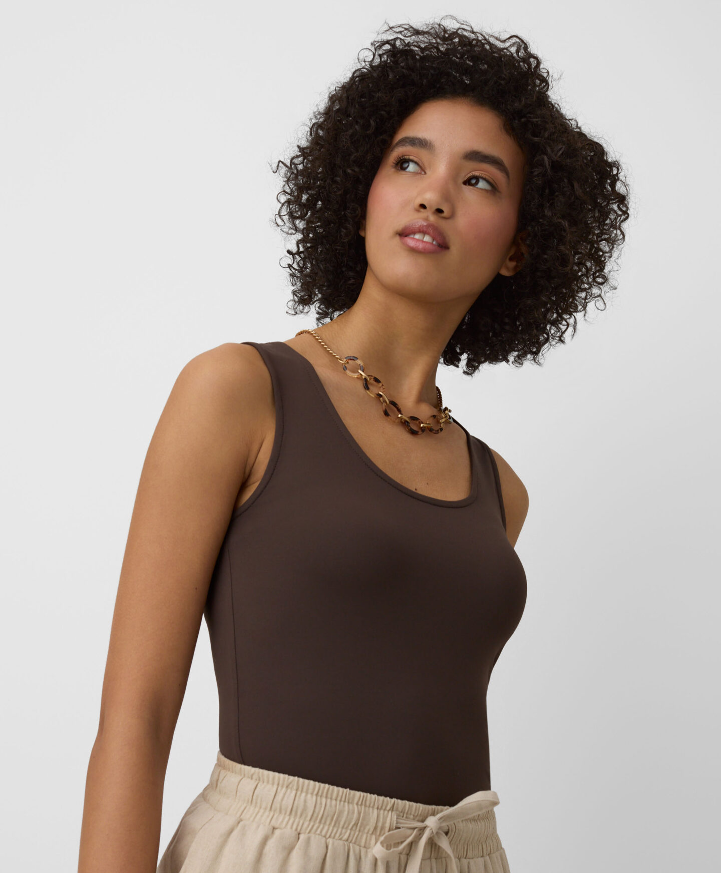 Smeđa ženska majica bez rukava nevjerojatno je svestrana. Odlično pristaje uz traperice, chino hlače, kratke hlače ili donje dijelove trenirke. Možete je nositi ispod jakne ili pulovera. Glatka tekstura i jednostavan dizajn čine ovu majicu bez rukava odličnom bazom za sve odjevne kombinacije. Dostupna je u tri boje.