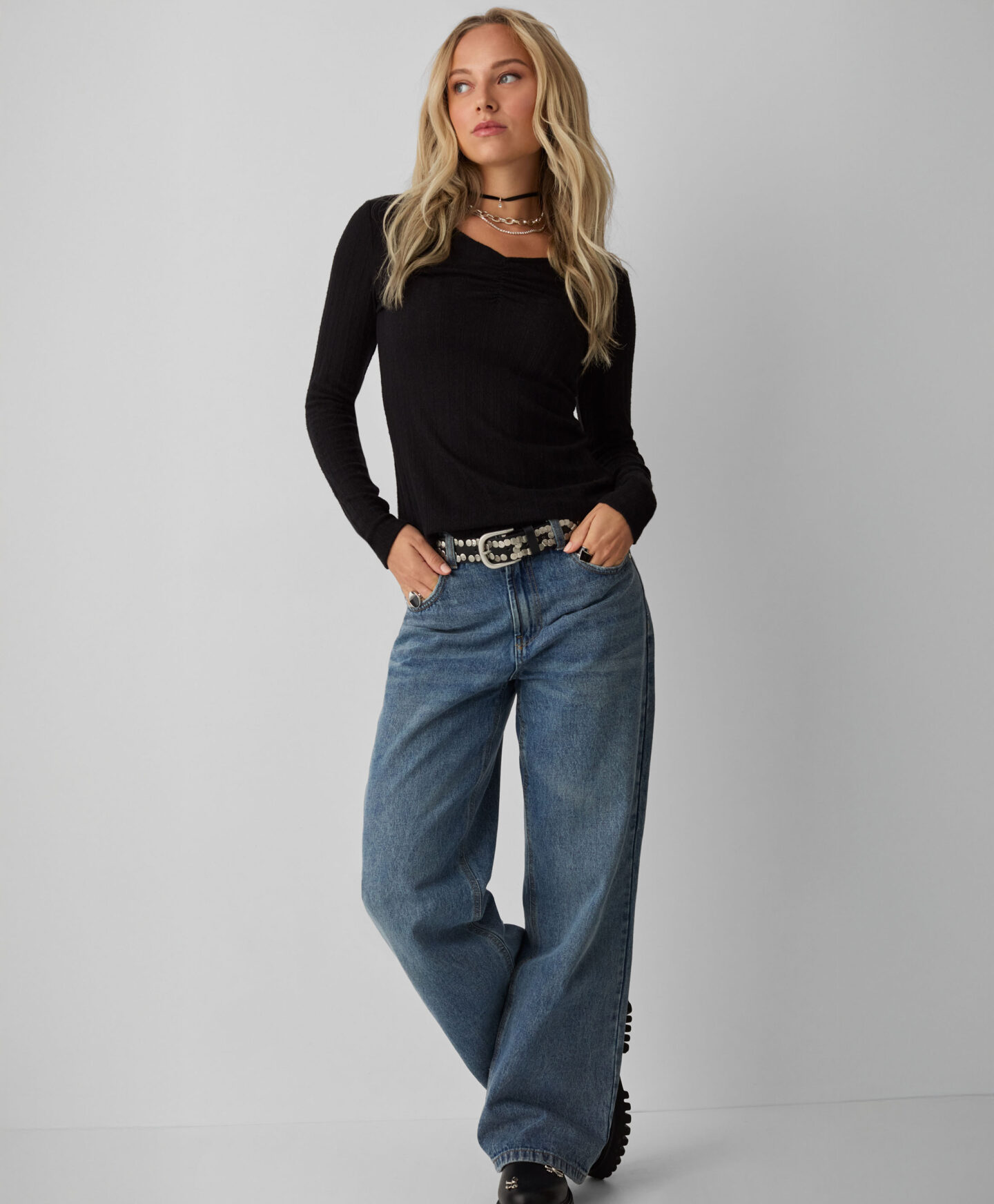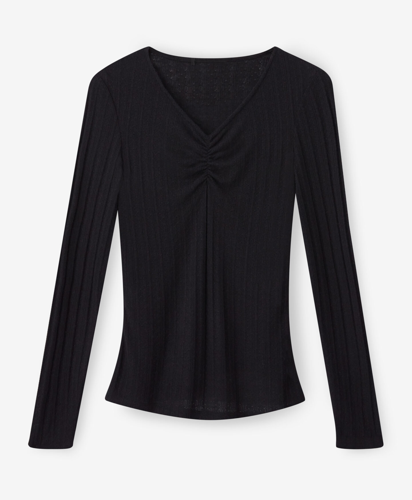 Ženska majica dugih rukava s naborima stvorena je za ljubiteljice klasičnih odjevnih kombinacija. Odlično će pristajati ispod šireg sakoa ili pulovera tijekom hladnih dana, pružajući dodatni sloj topline. Nabiranje na izrezu ženstven je detalj koji ističe vaše atribute. Zahvaljujući crnoj boji, pristaje uz gotovo sve.