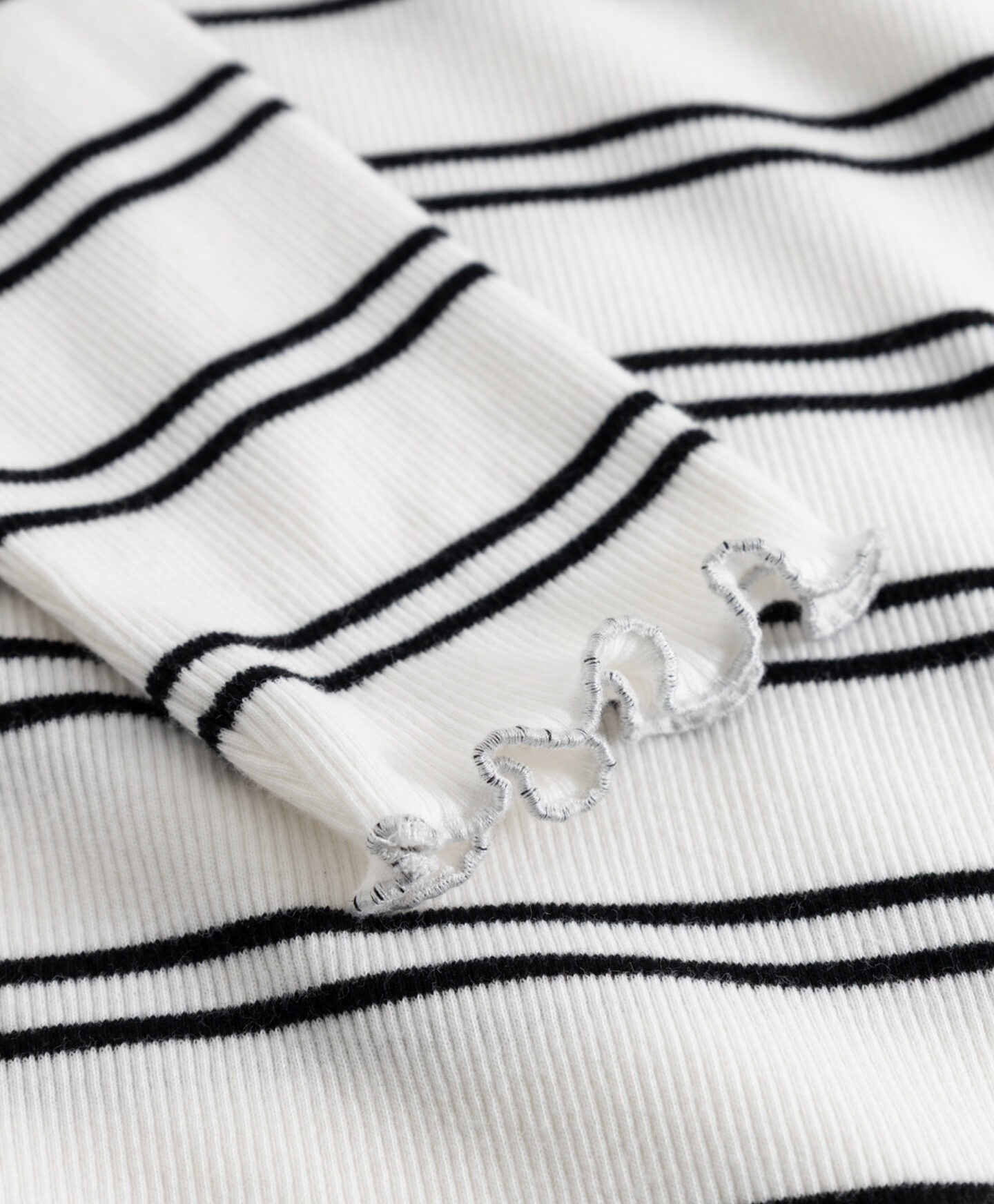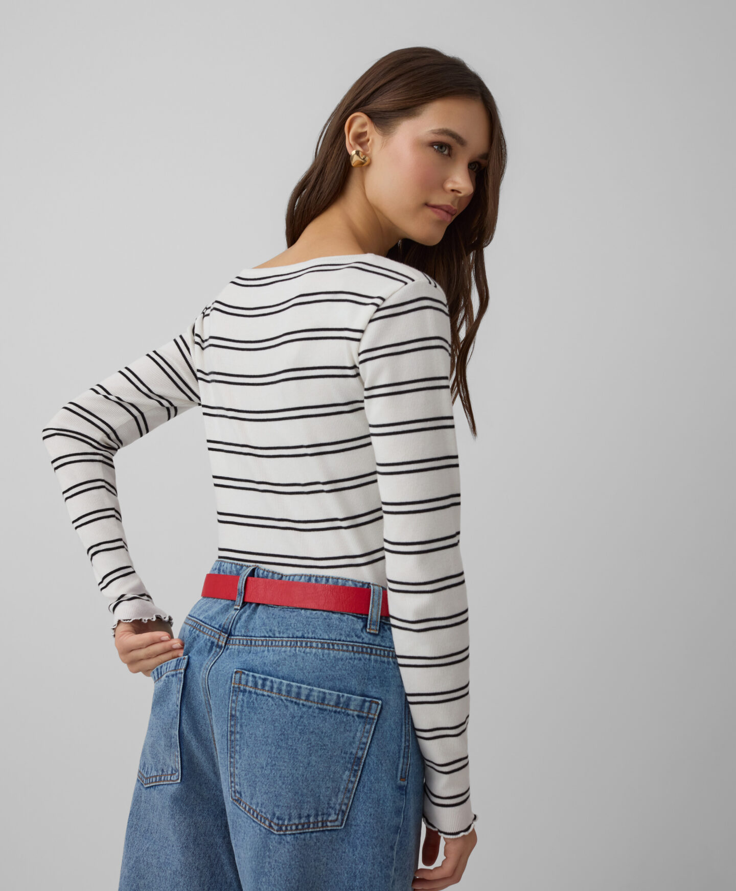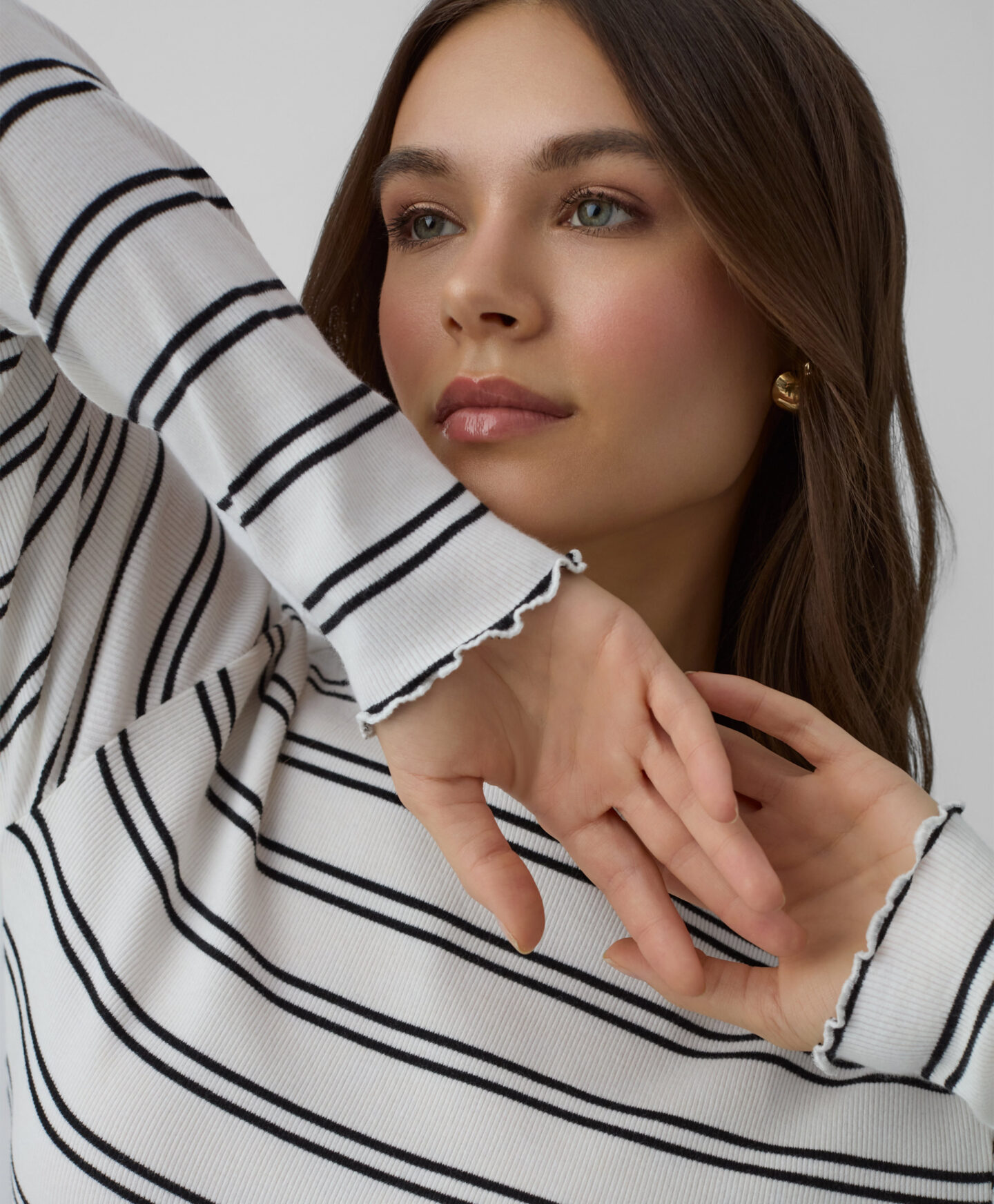 Bijela ženska majica dugih rukava s prugama ima visok udio pamuka i dodatak elastana pa savršeno pristaje figuri. Dekorativni detalji bit će moderan dodatak svakoj odjevnoj kombinaciji. Majica dobro pristaje uz traperice i elegantne hlače. Dostupna je u dvije boje.