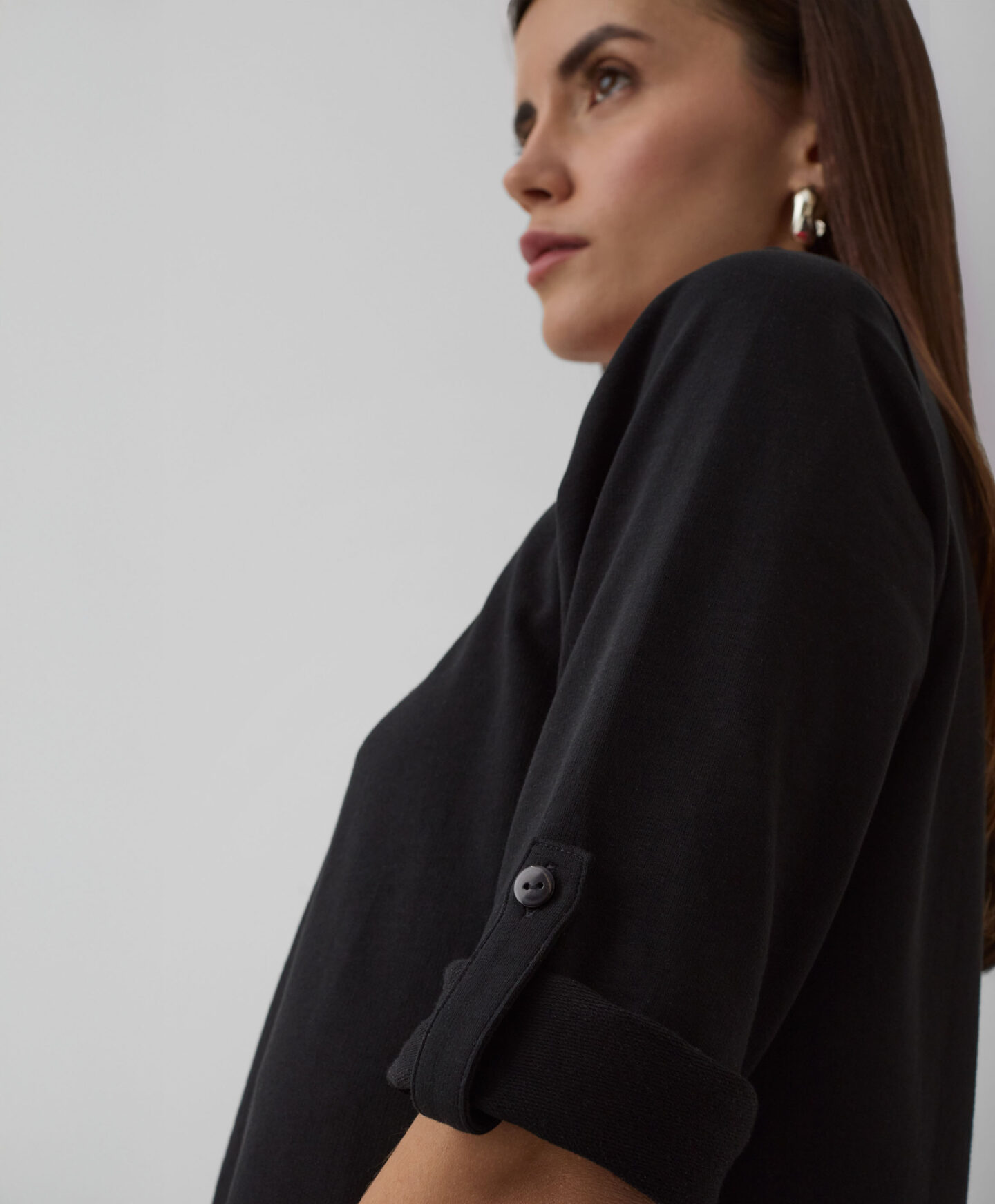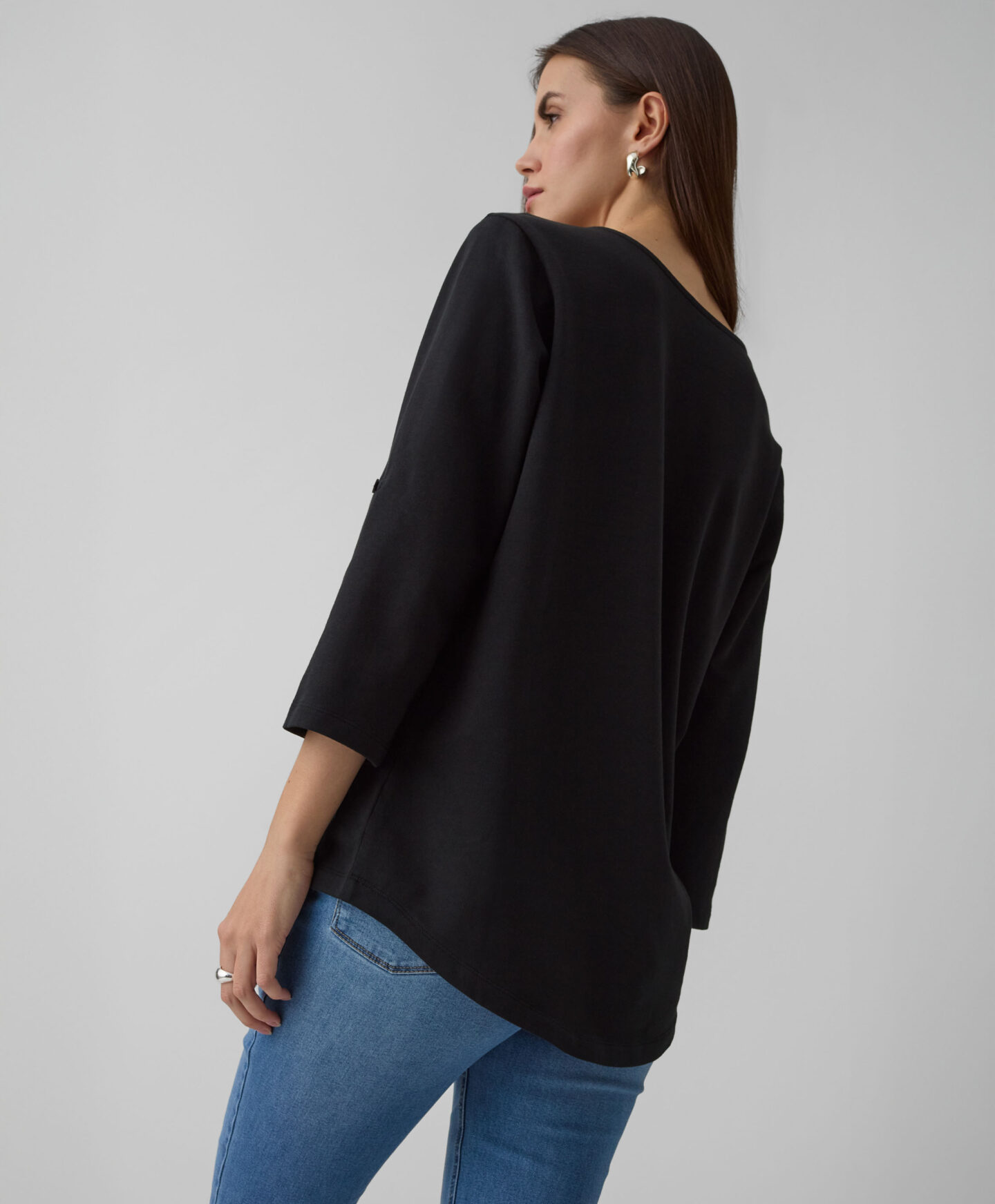 Ženska majica dugih rukava sa zaobljenim rubom i zarolanim rukavima klasičan je komad u malo drugačijem izdanju. Univerzalna crna boja i mekan materijal s visokim udjelom pamuka učinit će ovu majicu vašom omiljenom! Izgleda odlično u kombinaciji s vašim omiljenim trapericama, elegantnim ili sportskim hlačama. Možete je nositi za vrijeme šetnje vikendom u kombinaciji s prslukom, u uredu ispod sakoa i u kombinaciji s mekom košuljom tijekom opuštanja kod kuće.