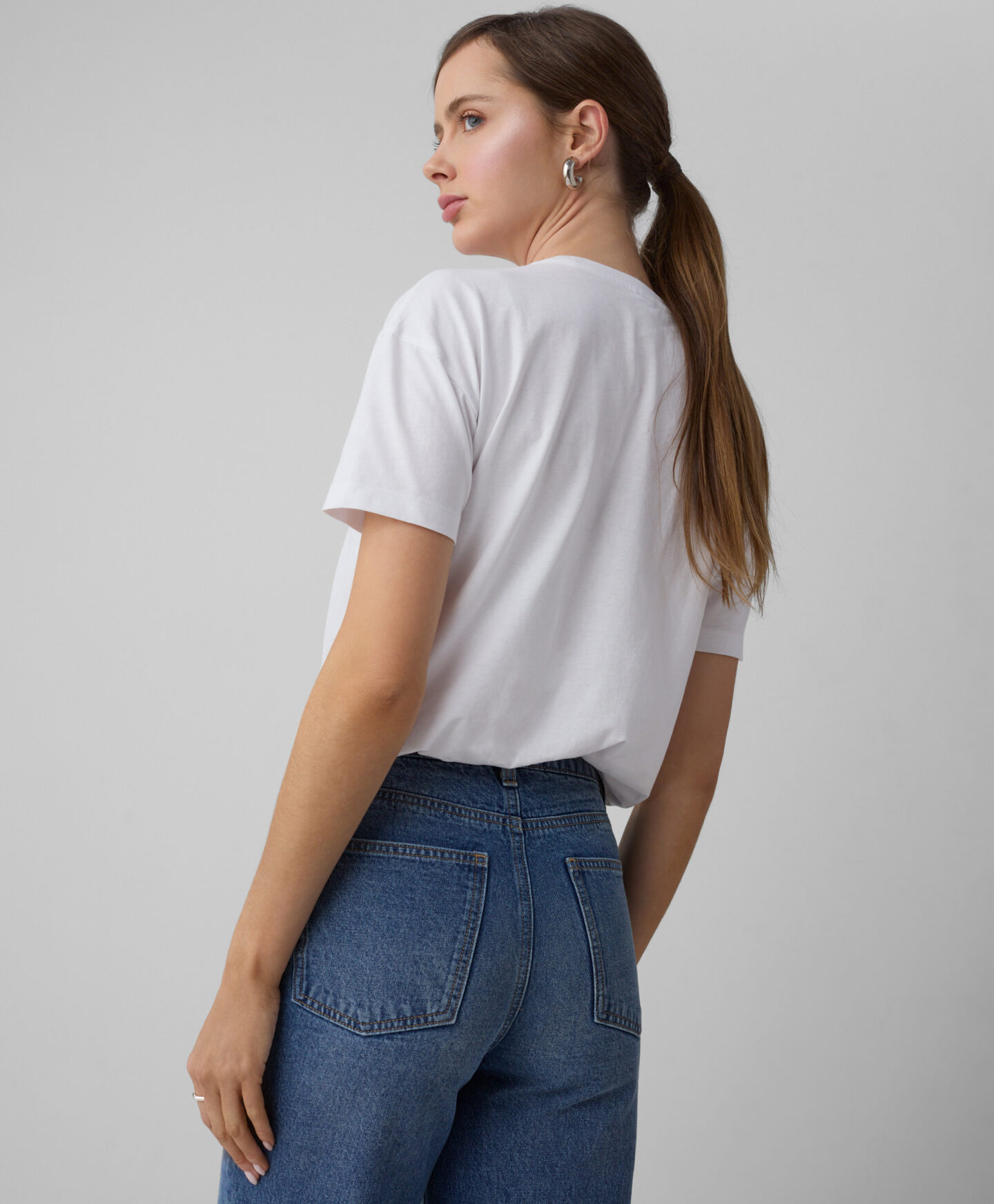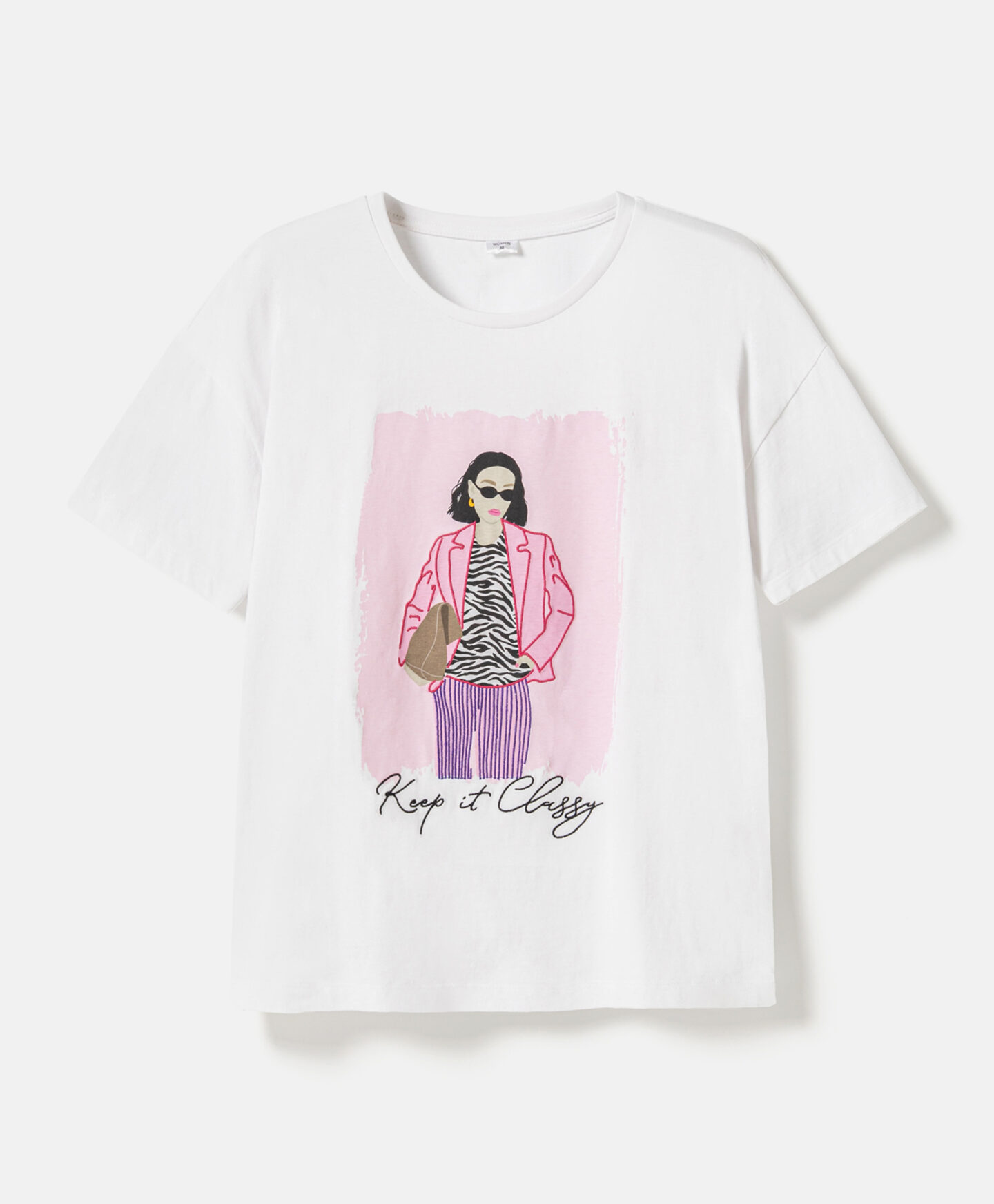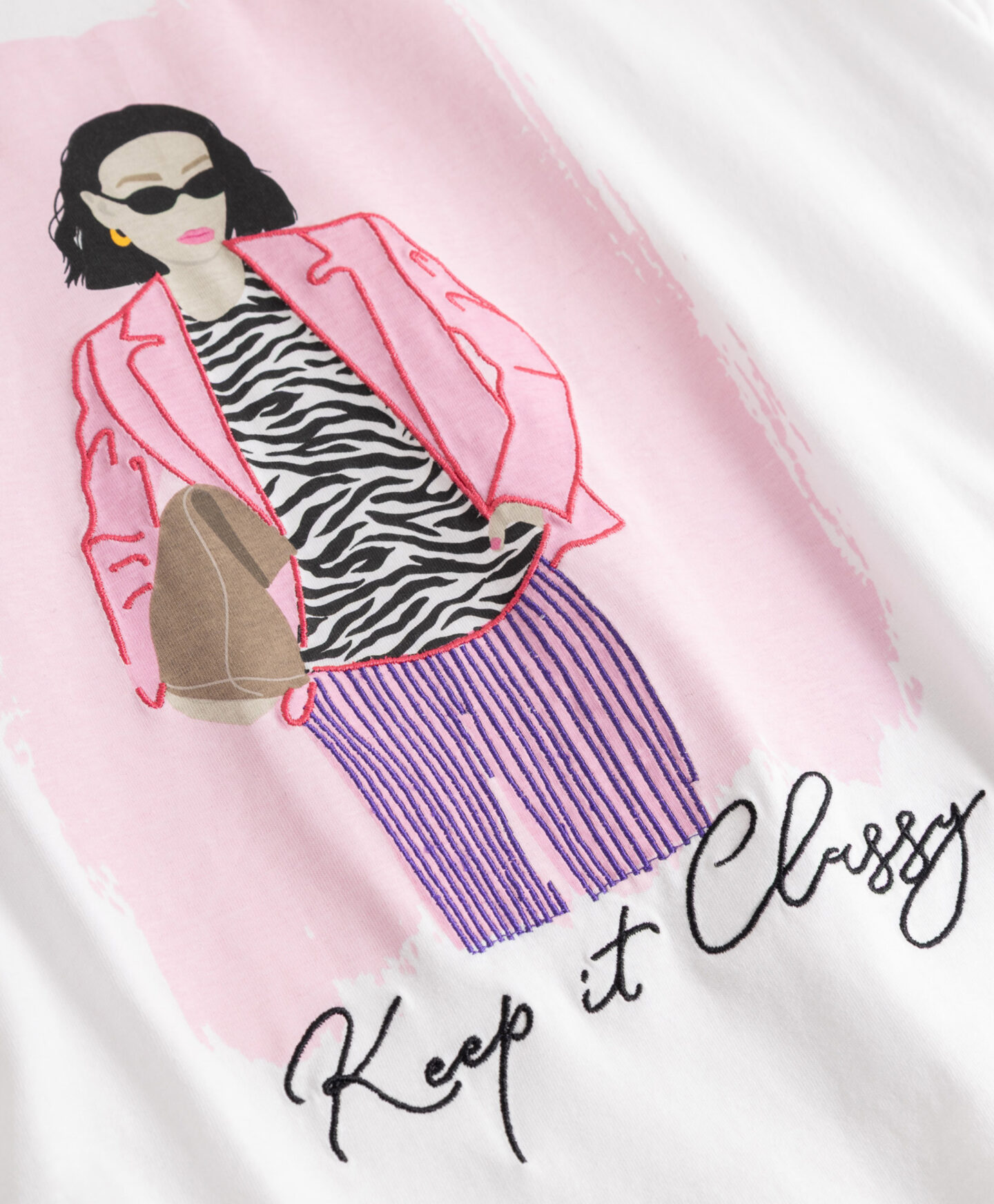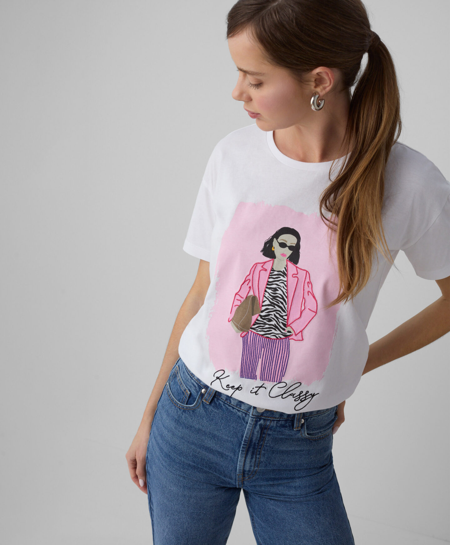Ženska majica kratkih rukava od 100% pamuka nježna je prema koži, prozračna i jednostavna za održavanje. Zahvaljujući prirodnom materijalu, udobna je i savršena za svaku prigodu. Majica ima elegantan otisak, što je čini posebnom. Izvrstan je izbor za žene koje se žele izraziti kroz odjeću.