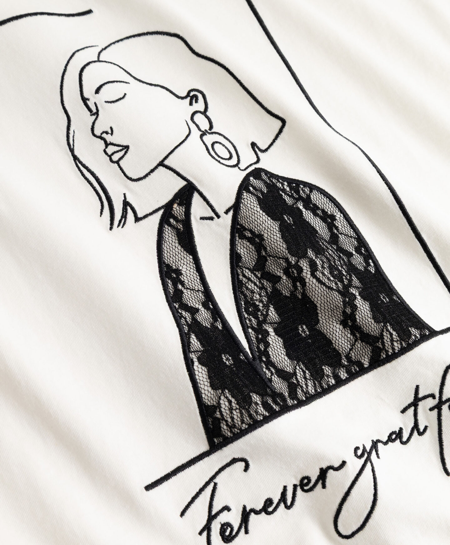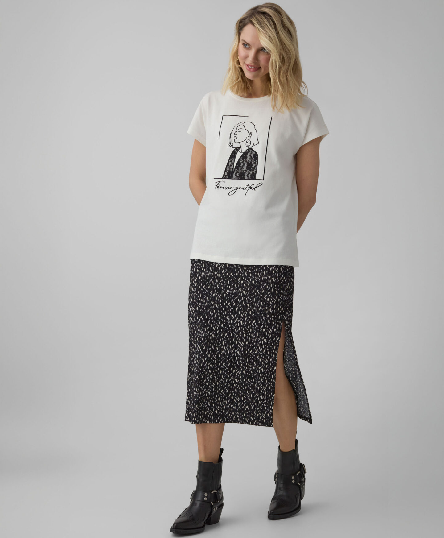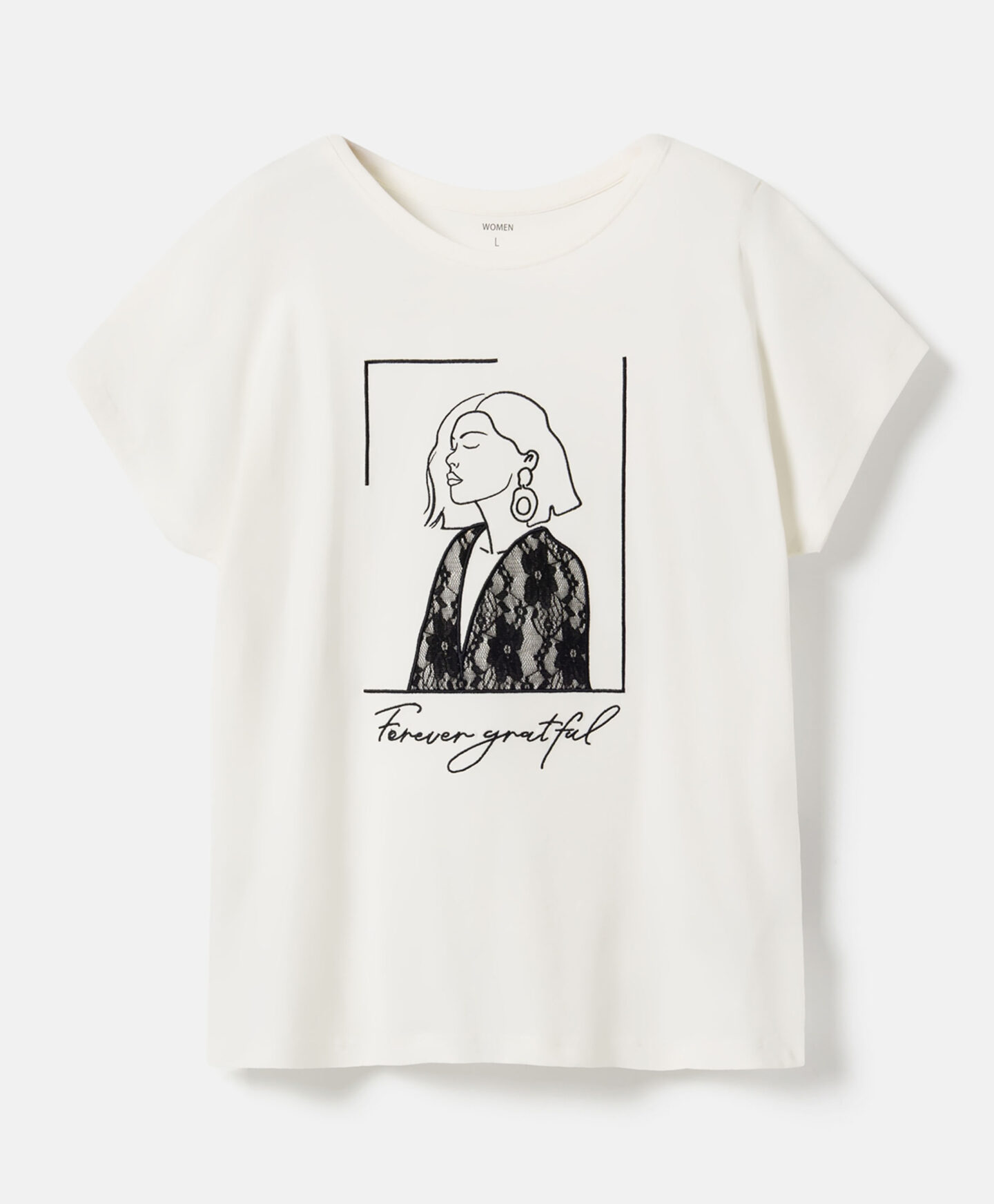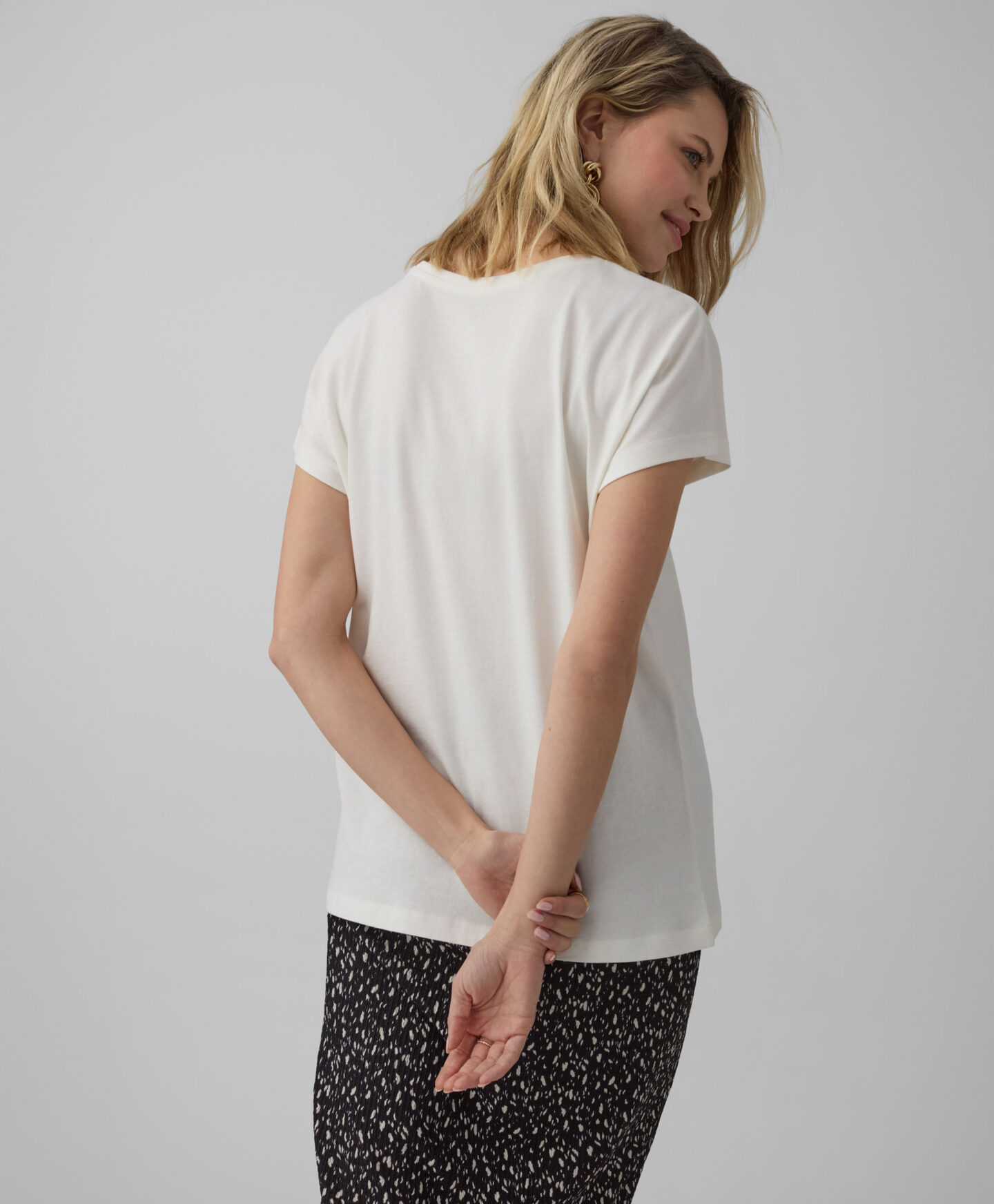 Ženska majica kratkih rukava od 100% pamuka ističe se otiskom na prsima. Naizgled klasična, ova majica kratkih rukava s modernim detaljima privlači pažnju i izvrsno izgleda u svakoj odjevnoj kombinaciji. Odlično pristaje uz traperice ili suknje. Također se može kombinirati s elegantnim hlačama i sakoom za posebne prigode. Mekana je, ugodna na dodir i omogućuje koži da diše.