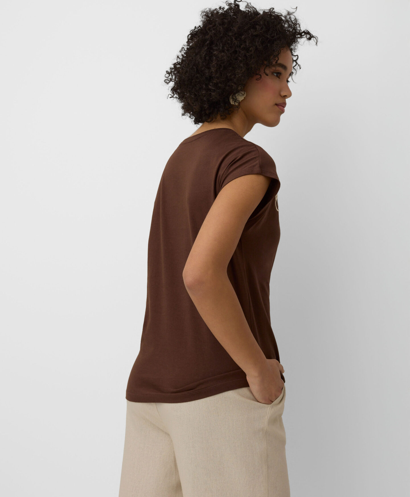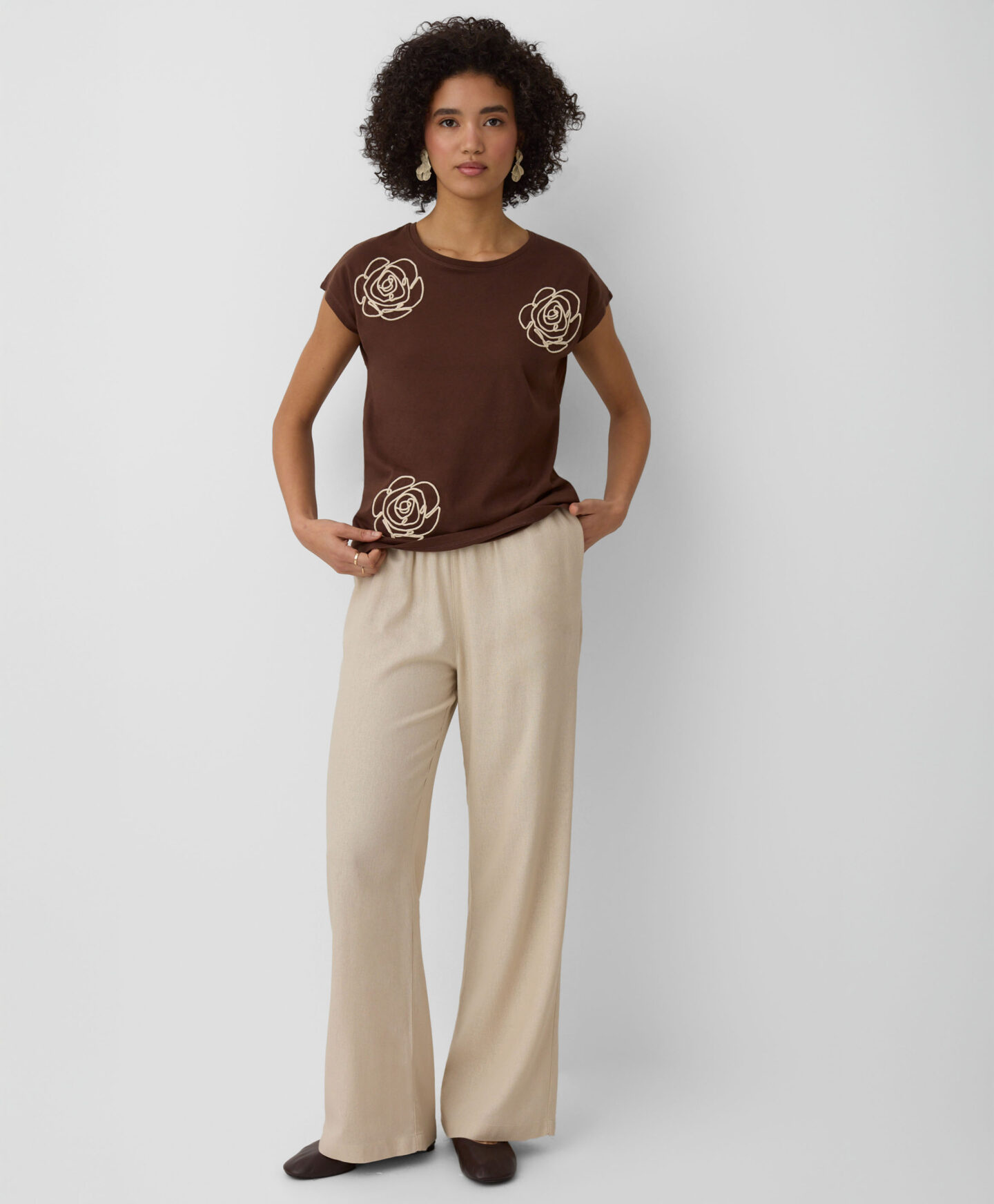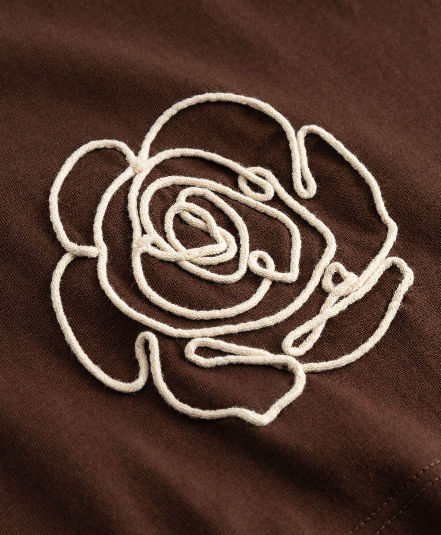 Ženska majica kratkih rukava od 100% pamuka s cvjetnim otiskom na prsima oduševit će sve. Bež ruže lijepo se ističu na smeđoj pozadini, dodajući dašak elegancije. Mekana pamučna tkanina dopušta vašoj koži da diše, što je čini savršenom i za toplije dane i slojevite odjevne kombinacije. Savršena je za kombiniranje s omiljenim trapericama, donjim dijelovima trenirke ili elegantnim hlačama.