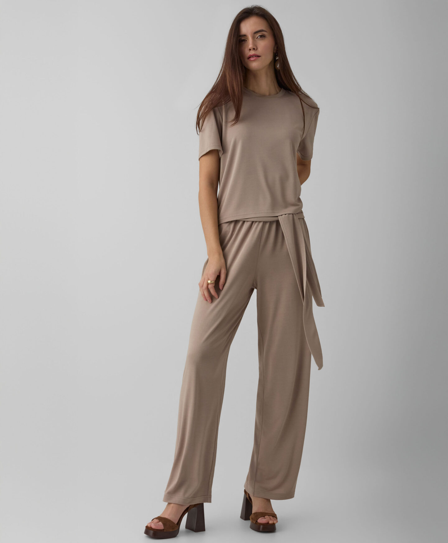 Ženska bež majica kratkih rukava savršeno pristaje uz hlače s vezicom u struku, ali će se odlično slagati i s većinom odjeće u vašoj garderobi. Sve je to zahvaljujući klasičnom kroju i bezvremenskoj boji koja nikada ne izlazi iz mode. Lagani materijal s dodatkom viskoze mekan je, ugodan na dodir i iznimno udoban. U kolekciji su dostupna dva dizajna.