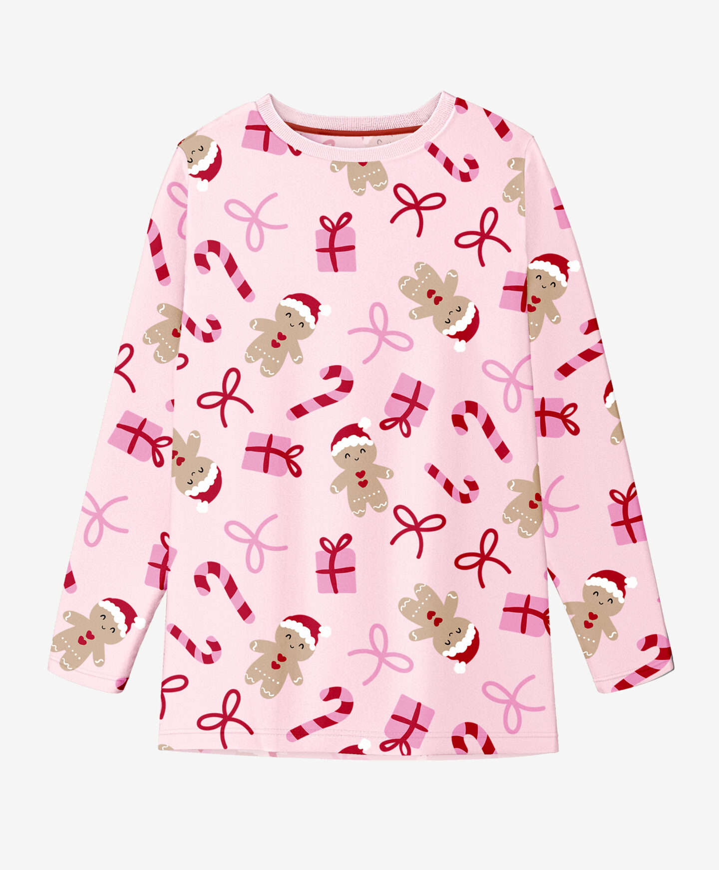 Ženska pidžama od velura s blagdanskim motivom medenjaka, poklona i mašnice odlična je ideja za poklon. Komplet se sastoji od majice dugih rukava i hlača od mekanog, toplog baršuna, što ga čini savršenim za zimske noći.