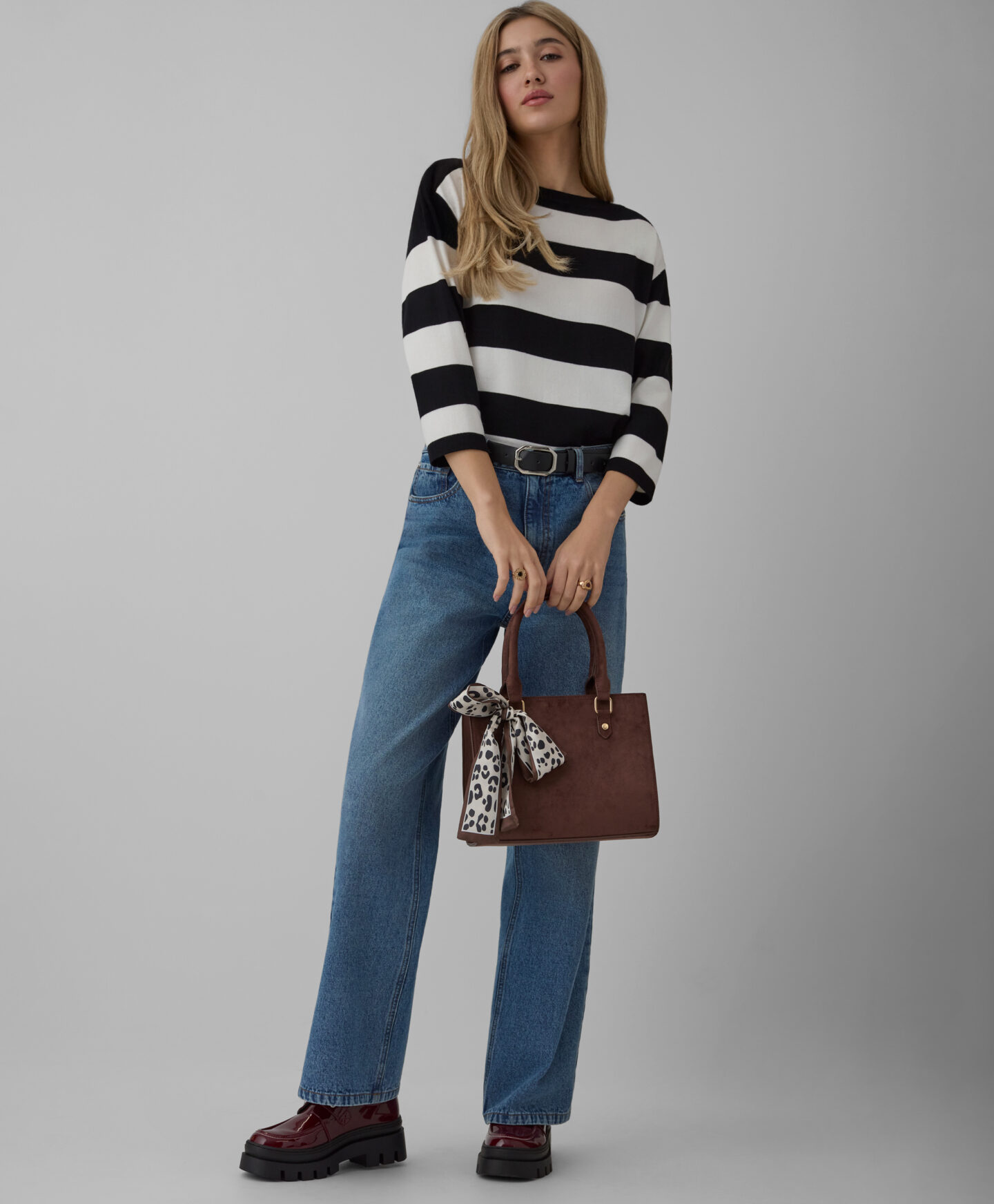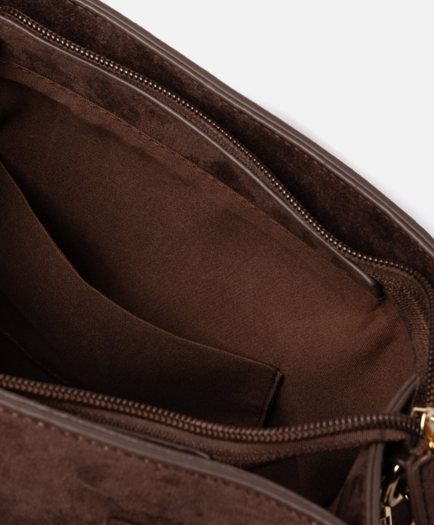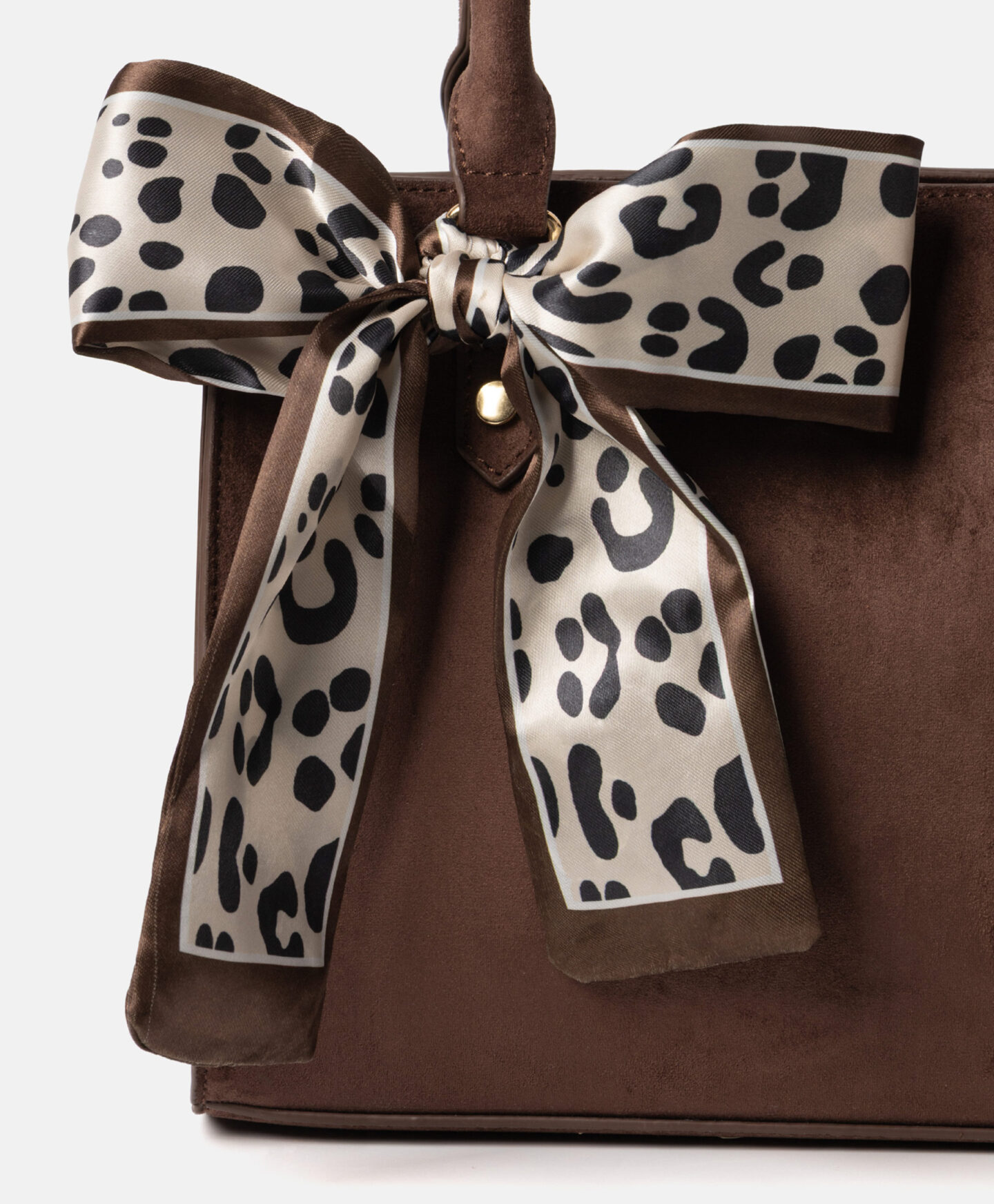 Smeđa ženska torbica s dekorativnom maramom elegantan je dodatak koji kombinira klasičan stil s modernim detaljem. Napravljena je od izdržljivih materijala i upotpunjuje svaku odjevnu kombinaciju. Dekorativna marama čini je jedinstvenom.