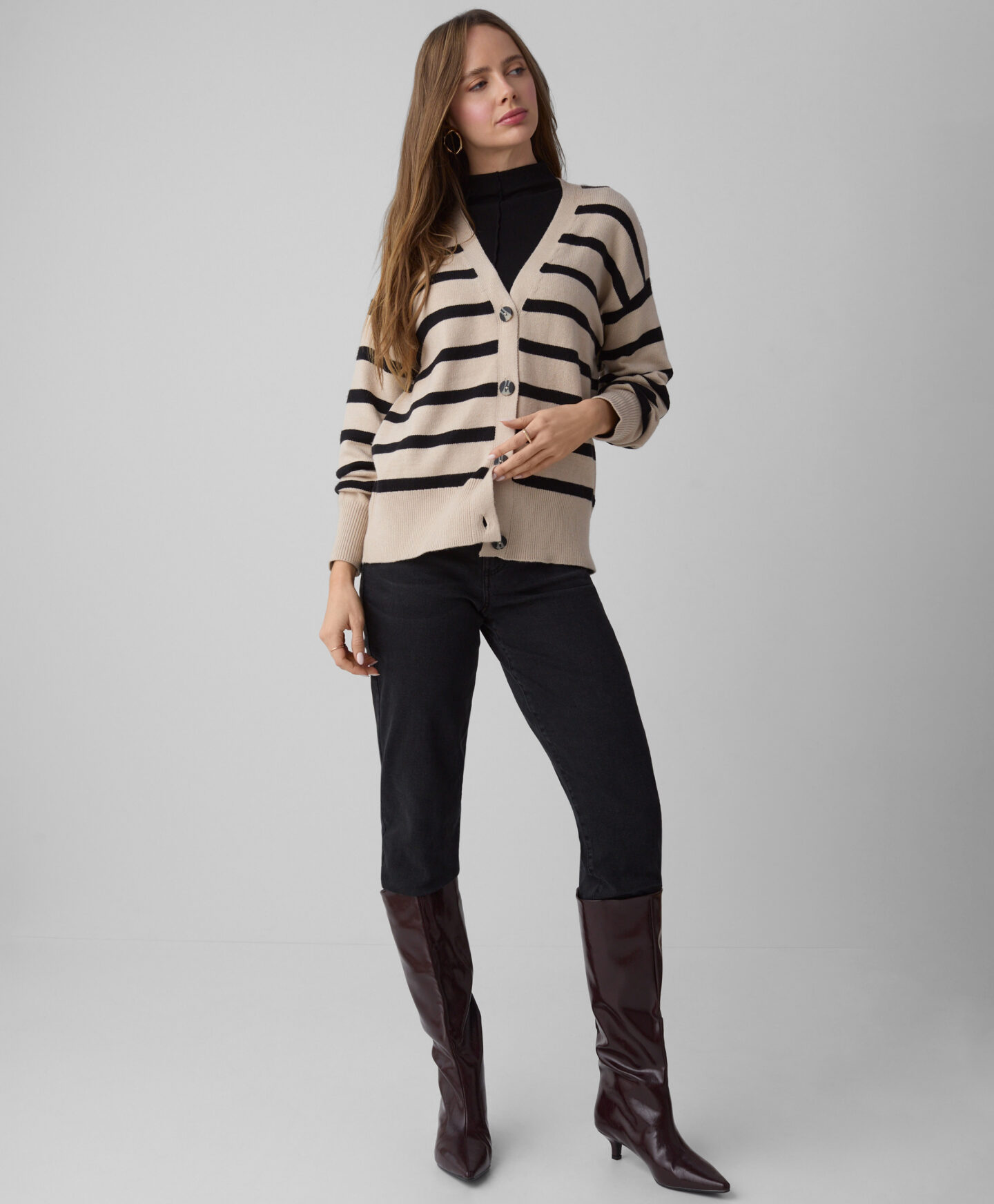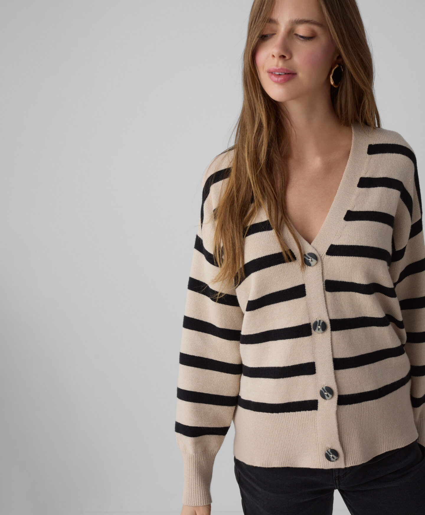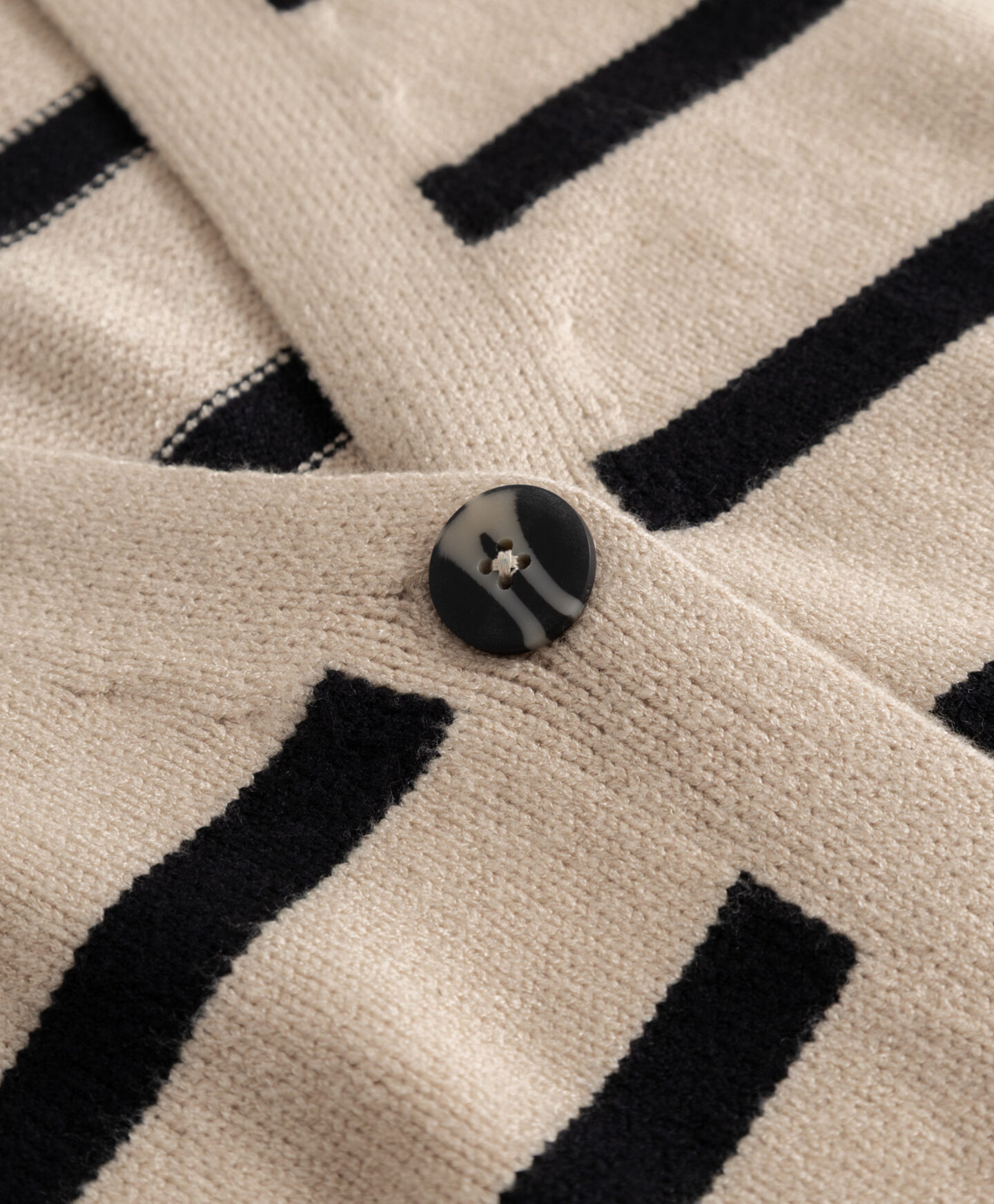 Ženska vesta s crnim i bež prugama i širokog kroja savršen je odabir za ljubiteljice udobnih modnih klasika. Prugasti motiv nikada ne izlazi iz mode i izgleda odlično uz elegantne hlače i klasične traperice. Mekani materijal s viskozom nježno obavija kožu i pruža toplinu tijekom hladnih zimskih dana. Dostupna je u dvije boje.